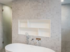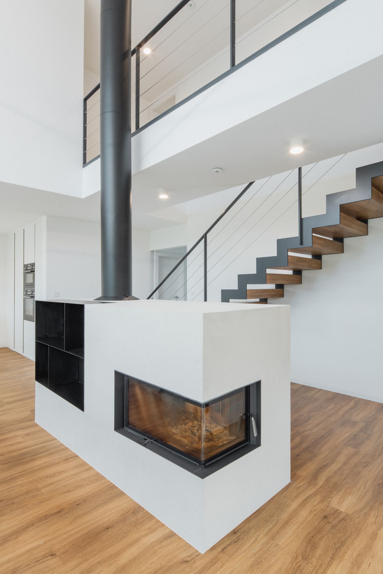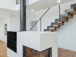 Dalším výrazným prvkem domu je akumulační krb, na který je vidět nejen z kuchyně, ale i z obývacího pokoje. Přestože se přestane topit, obestavba dalších deset až dvanáct hodin sálá teplo. „Večer tak můžete s kamarády popíjet, přikládat do ohně a ráno stále cítíte teplo,“ vysvětluje Janout.