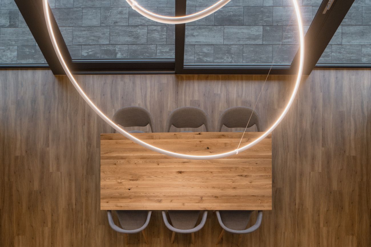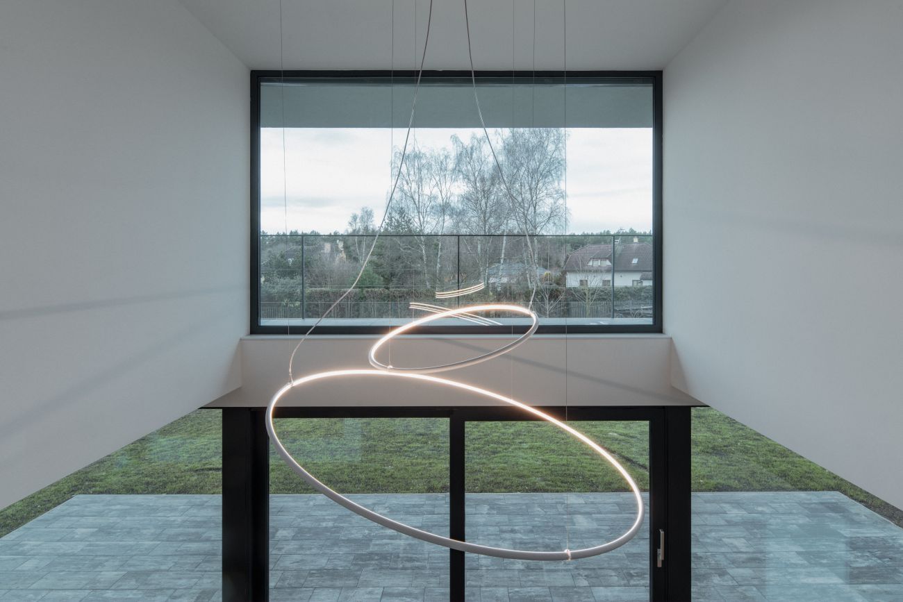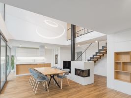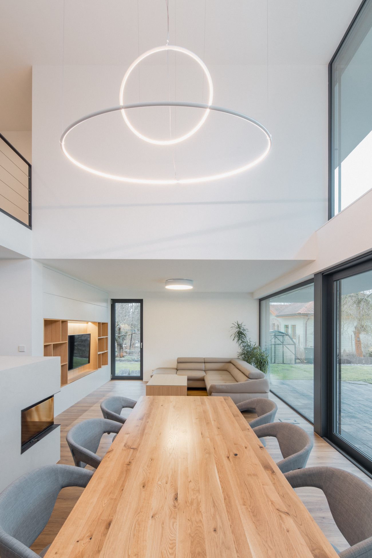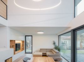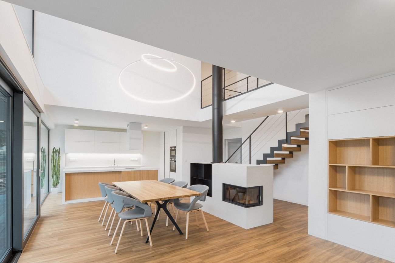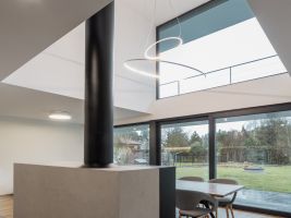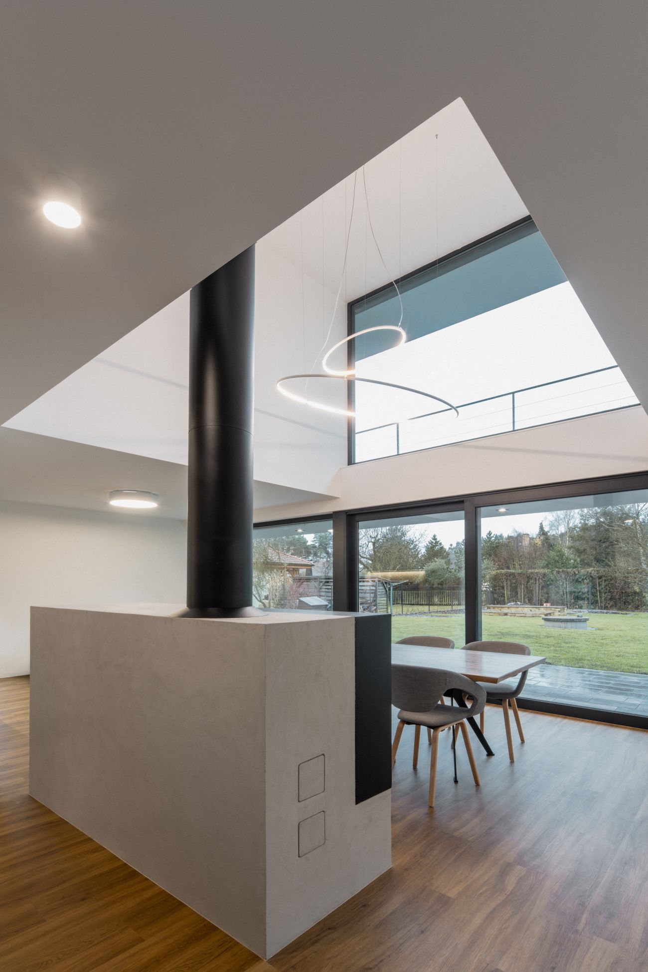 Předložený návrh splňuje nejen estetické, ale i technické požadavky klienta. Jeho tým si dokázal poradit i s obtížně řešitelnými úkoly. „Hlavním přáním klienta bylo vytvoření moderního vzdušného interiéru. Současně nechtěl žádné šikmé stropy v patře. To ale bylo v přímém rozporu s územním plánem,“ vysvětluje Janout a ukazuje vstupní atrium, kterým problém vyřešili a jenž nakonec tvoří dominantu celého domu.