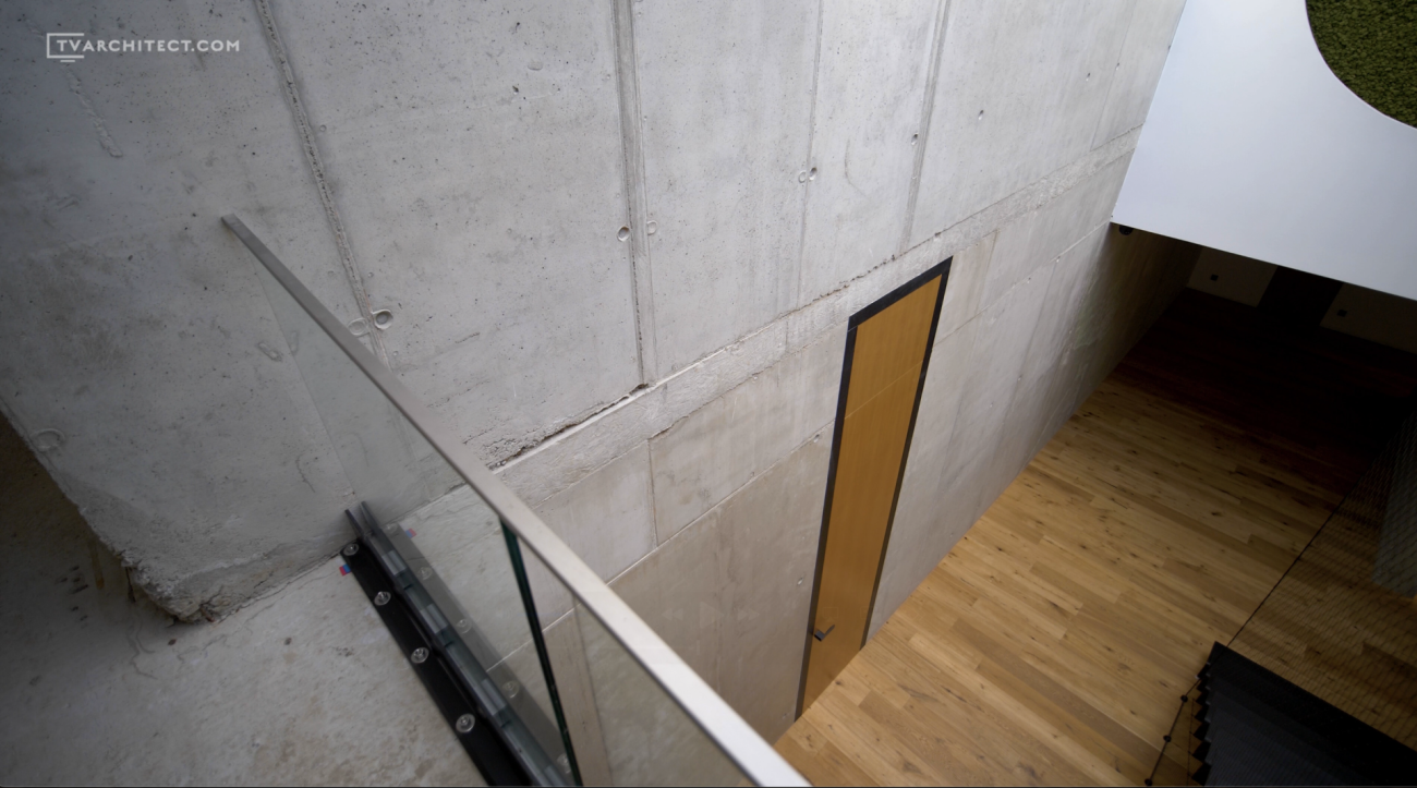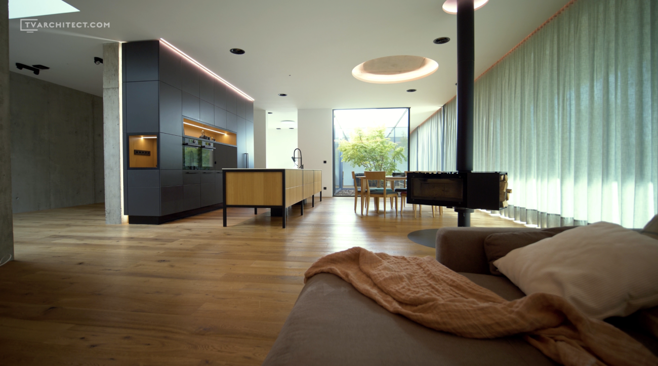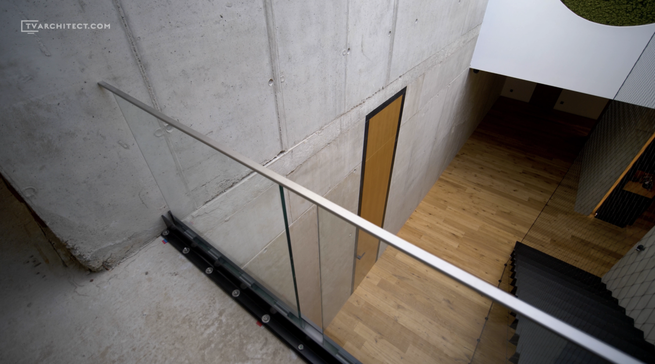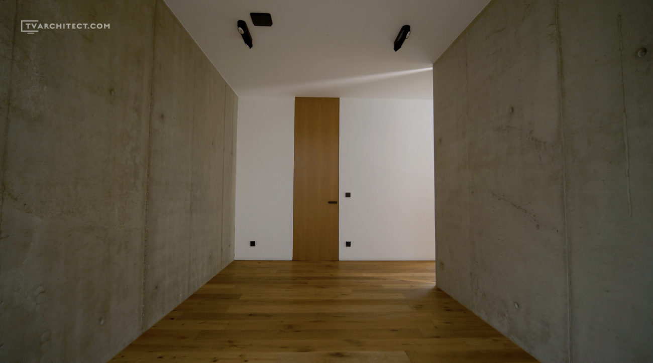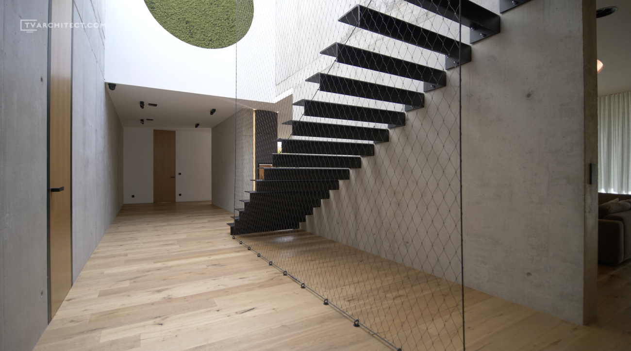 Beton je základním materiálem interiéru. Architekti jej ponechali v surové podobě, včetně nedolitých míst a přirozených stop po bednění. V kombinaci s hladkým dřevem a černými industriálními detaily vzniká vyvážený celek, který působí současně a autenticky. Tento princip doplňuje i schodiště se šířkou 1,5 metru, vytvořené z ohýbaných plechů o tloušťce 15 mm.