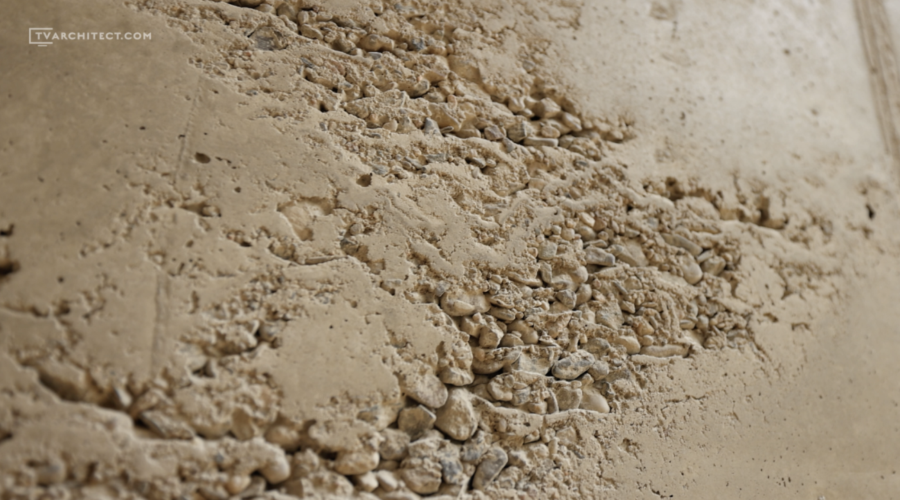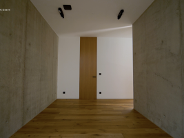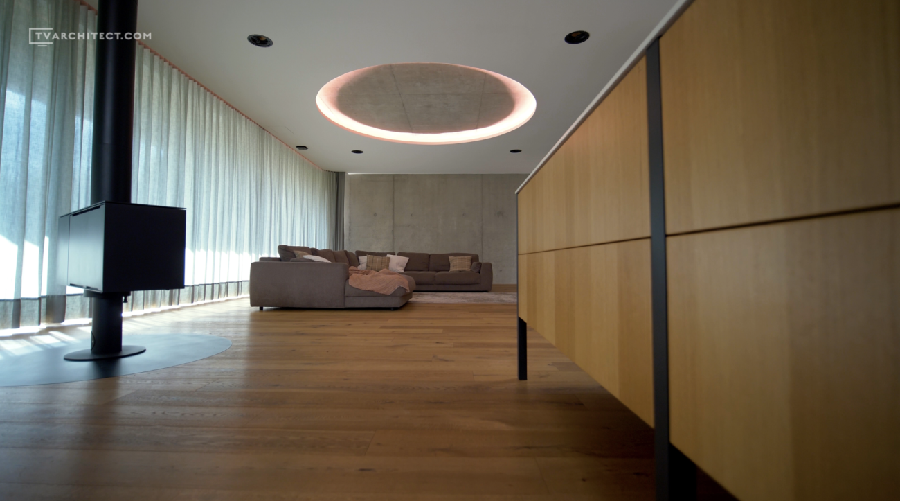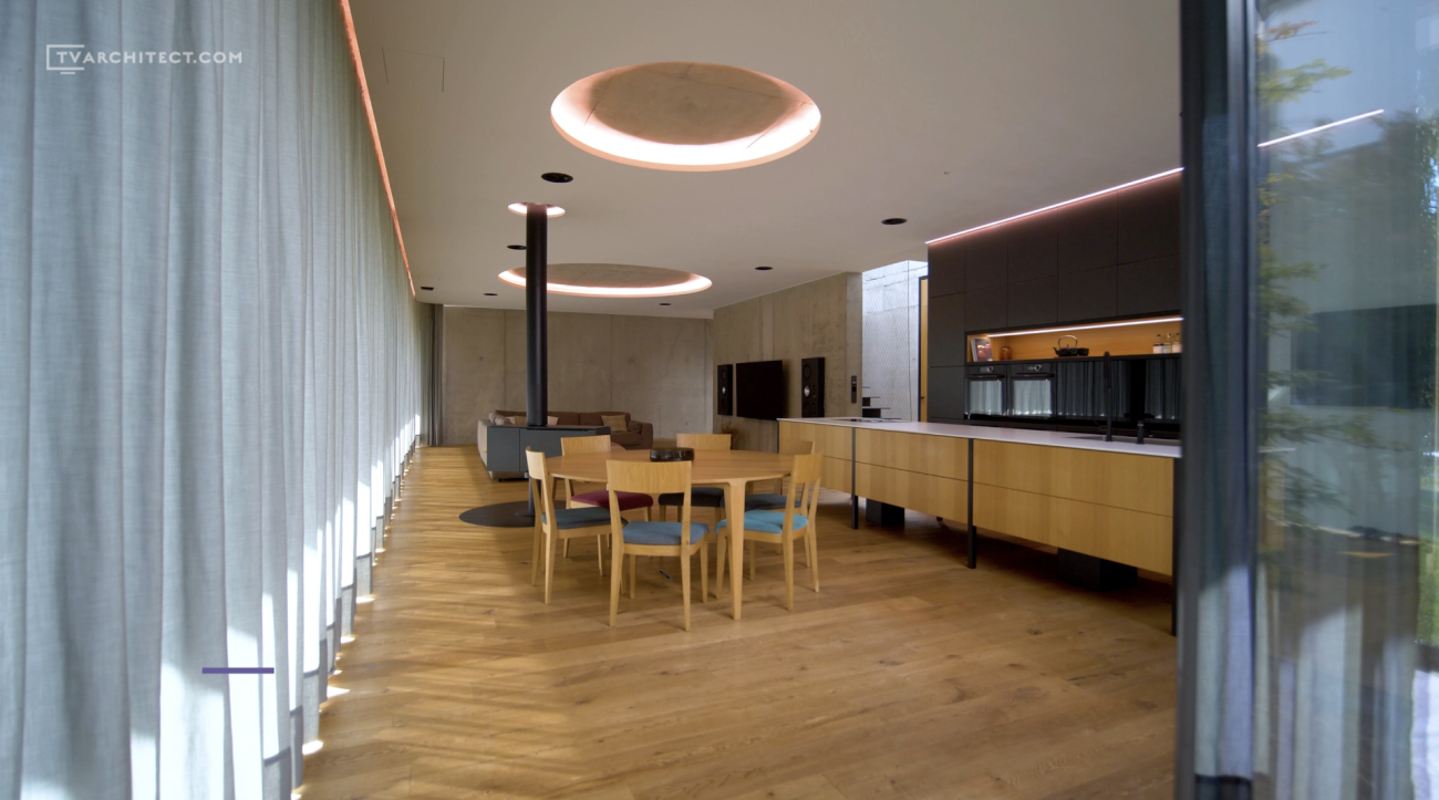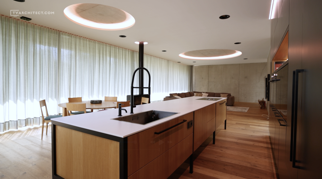 Beton je základním materiálem interiéru. Architekti jej ponechali v surové podobě, včetně nedolitých míst a přirozených stop po bednění. V kombinaci s hladkým dřevem a černými industriálními detaily vzniká vyvážený celek, který působí současně a autenticky. Tento princip doplňuje i schodiště se šířkou 1,5 metru, vytvořené z ohýbaných plechů o tloušťce 15 mm.