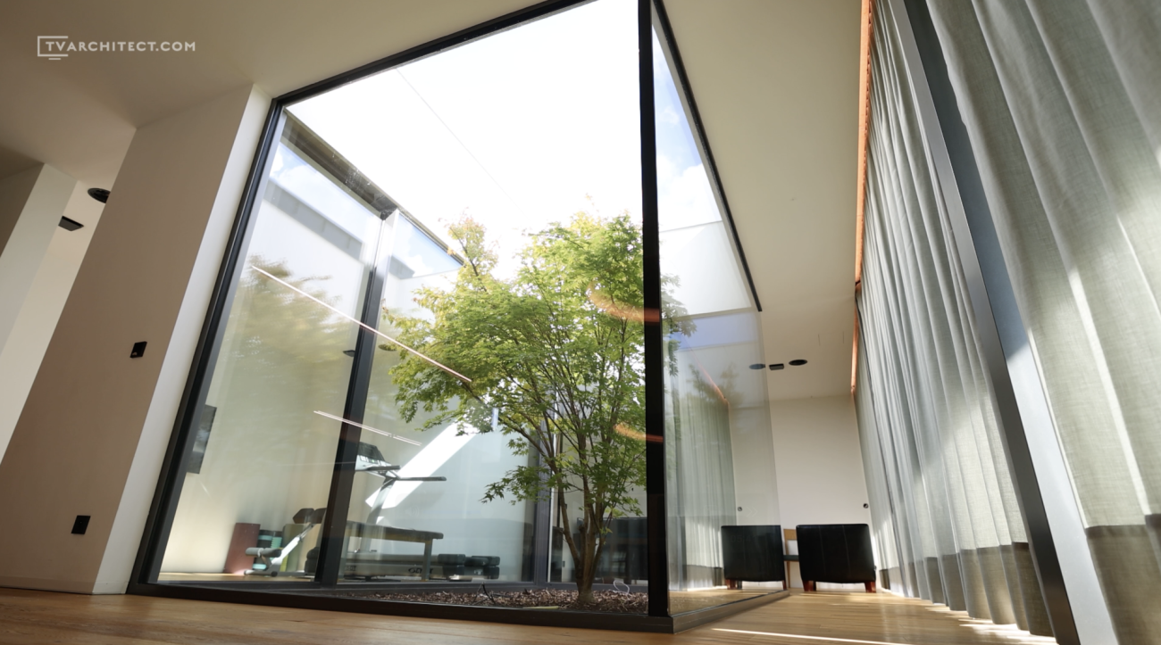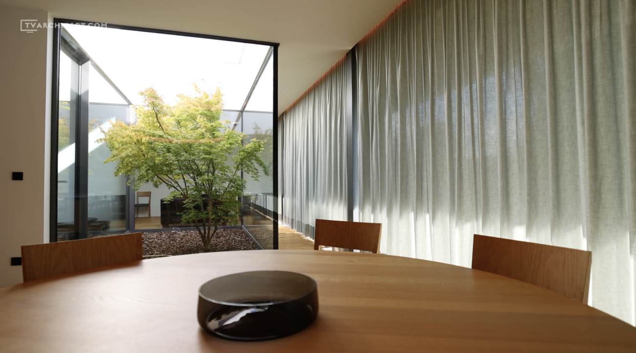 Interiér stavby pracuje se světlem a stínem tak, aby vytvářel různé atmosféry v průběhu dne. Výrazným prvkem je převýšená vstupní hala se světlíkem, která zaplavuje prostor denním světlem. Obytné místnosti jsou otevřené směrem k zahradě díky zasklení o celkové délce 15 metrů, z něhož 7 metrů tvoří posuvná část. Dům se tak opticky i funkčně propojuje s vrbou, rybníkem a celou zahradou.