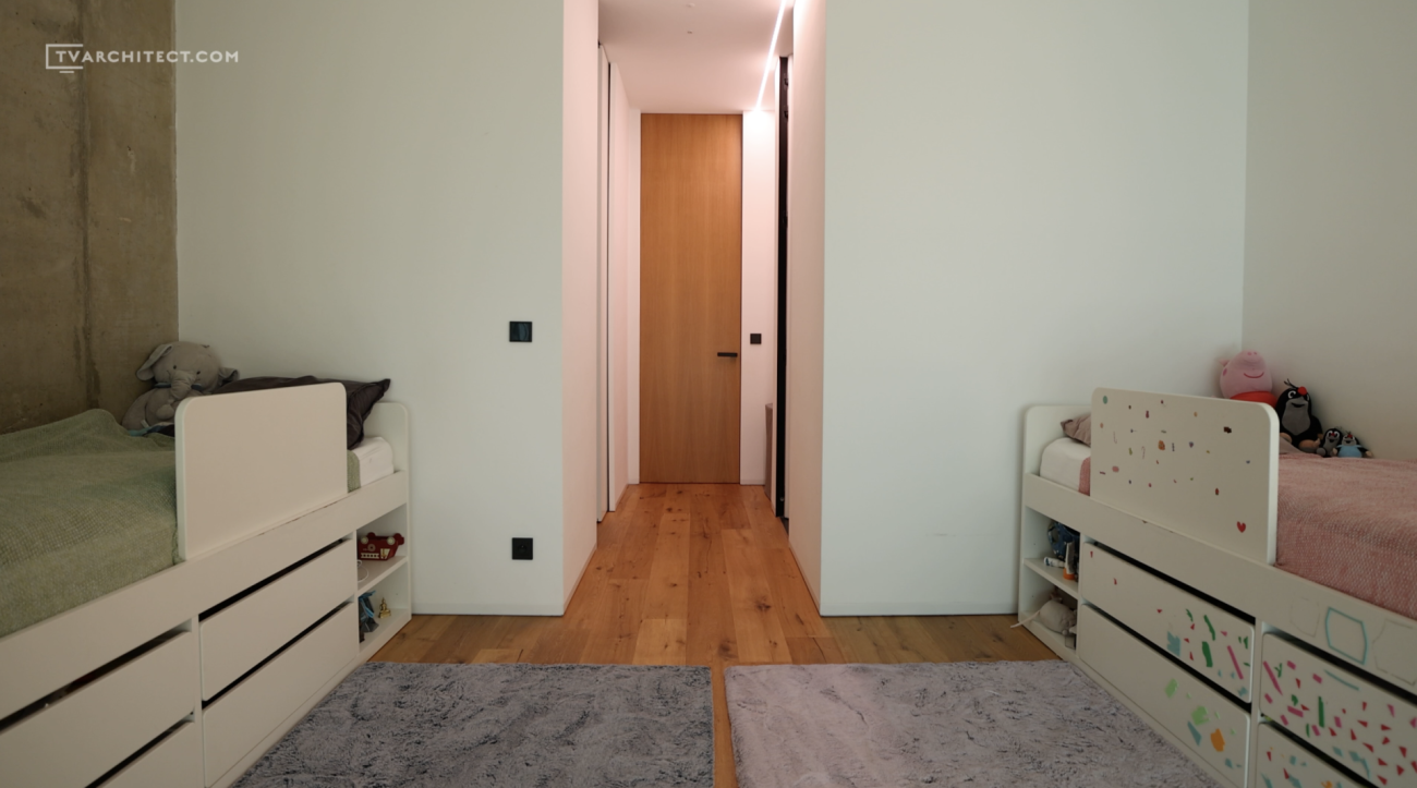 Křídlo s dětskými pokoji funguje jako samostatná část domu. Každý pokoj má vlastní šatnu, pokoje lze v budoucnu oddělit a sdílená koupelna je přístupná ze dvou stran. Beton v interiéru doplňují probarvované závěsy, které po zatažení vytvářejí jemnou barevnost. Architekti tak pracovali s materiálem nejen funkčně, ale i hravě.