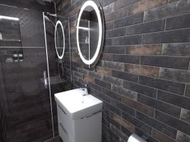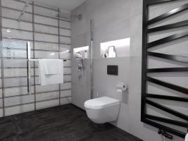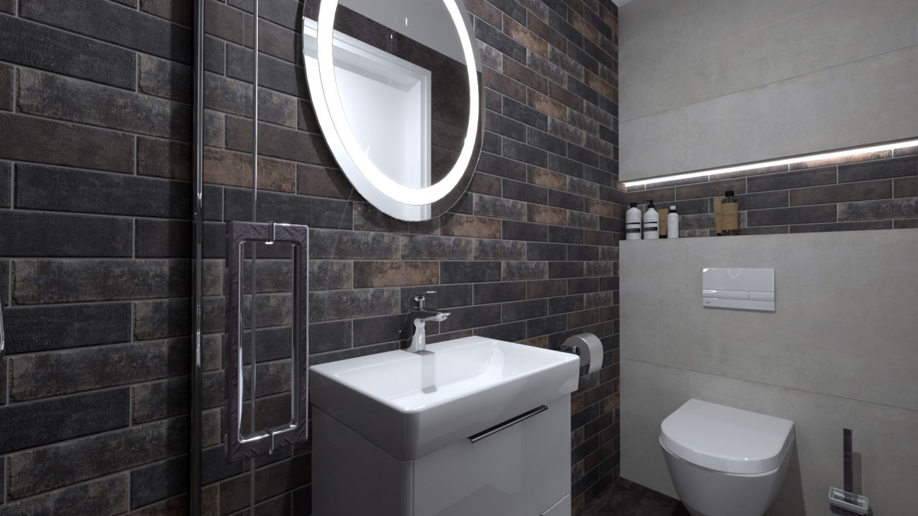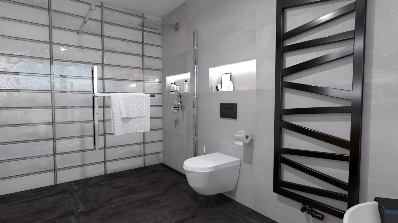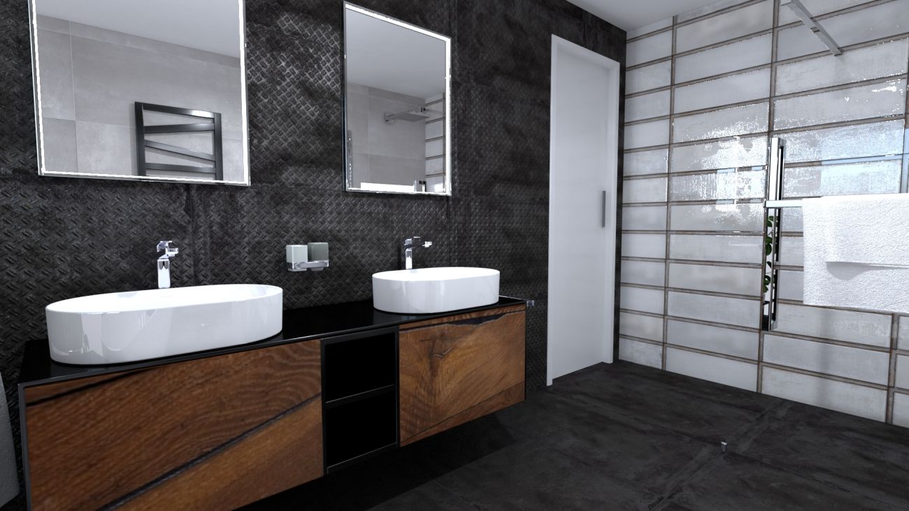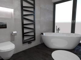 Zajímavostí této koupelny je i přes výrazné pojetí její jednoduchost a minimalismus. Jemné odstíny šedé až antracitové v kontrastu s černou barvou sanity dodávají prostorám naprostou originalitu a osobité pojetí.