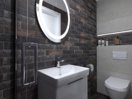 Velmi výrazné jsou keramickými luxfery, které na první pohled nerozeznáte od skutečných skleněných prvků. Žádná industriální koupelna se neobejde bez betonových prvků, v tomto případě se jedná o dlažbu se strukturou taženého betonu.