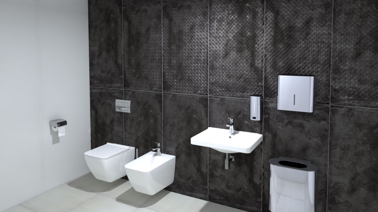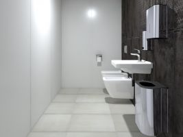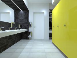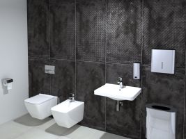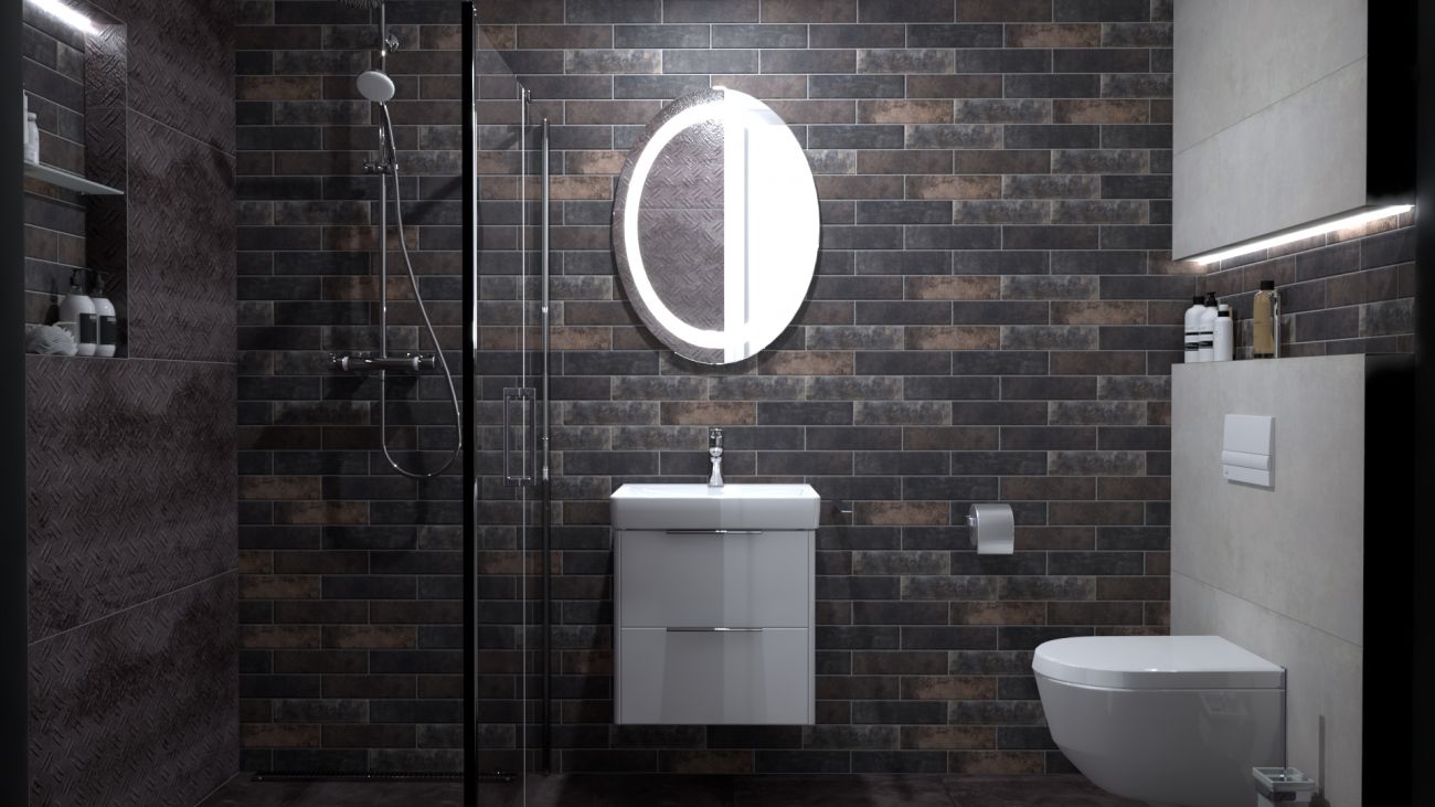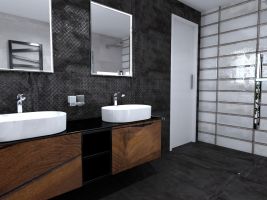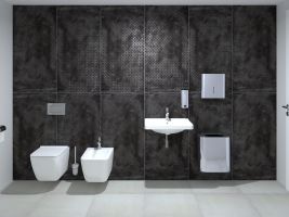 V industriální koupelně si můžete vyhrát s doplňky. K dlažbě ze série Diesel Living se skvěle hodí černé sanitární doplňky od firmy Villerouy a Boch s hranatými liniemi, prosklený kout typu walkin s vaničkou z litého mramoru, který má strukturu otesaného kamene či volně stojící vana. Sanita černé barvě je opatřena vrstvou ceramic+, což je úprava keramiky proti vodnímu kameni a bakteriím.