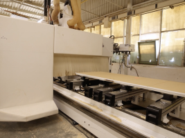 Po kompletaci výplní následuje lisování, kdy se na obě strany rámu připevní plášť a vznikne tak uzavřené dveřní křídlo. Tento polotovar pak putuje do CNC centra, kde se frézují klíčové detaily jako jsou polodrážky, otvory pro kliku, zámek i závěsy.