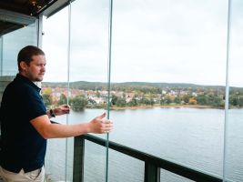 Velkou výhodou systému Lumon je jeho kompatibilita. Zábradlí a zasklení na sebe plynule navazují bez nutnosti dalších úprav, například doplechování nebo spojování různých prvků. Díky tomu vzniká čistý technický detail bez rizikových přechodů. Systém se kotví přímo do konstrukce, je dotažený ke stěnám i k podlaze, což zajišťuje dlouhou životnost a minimální údržbu.