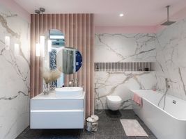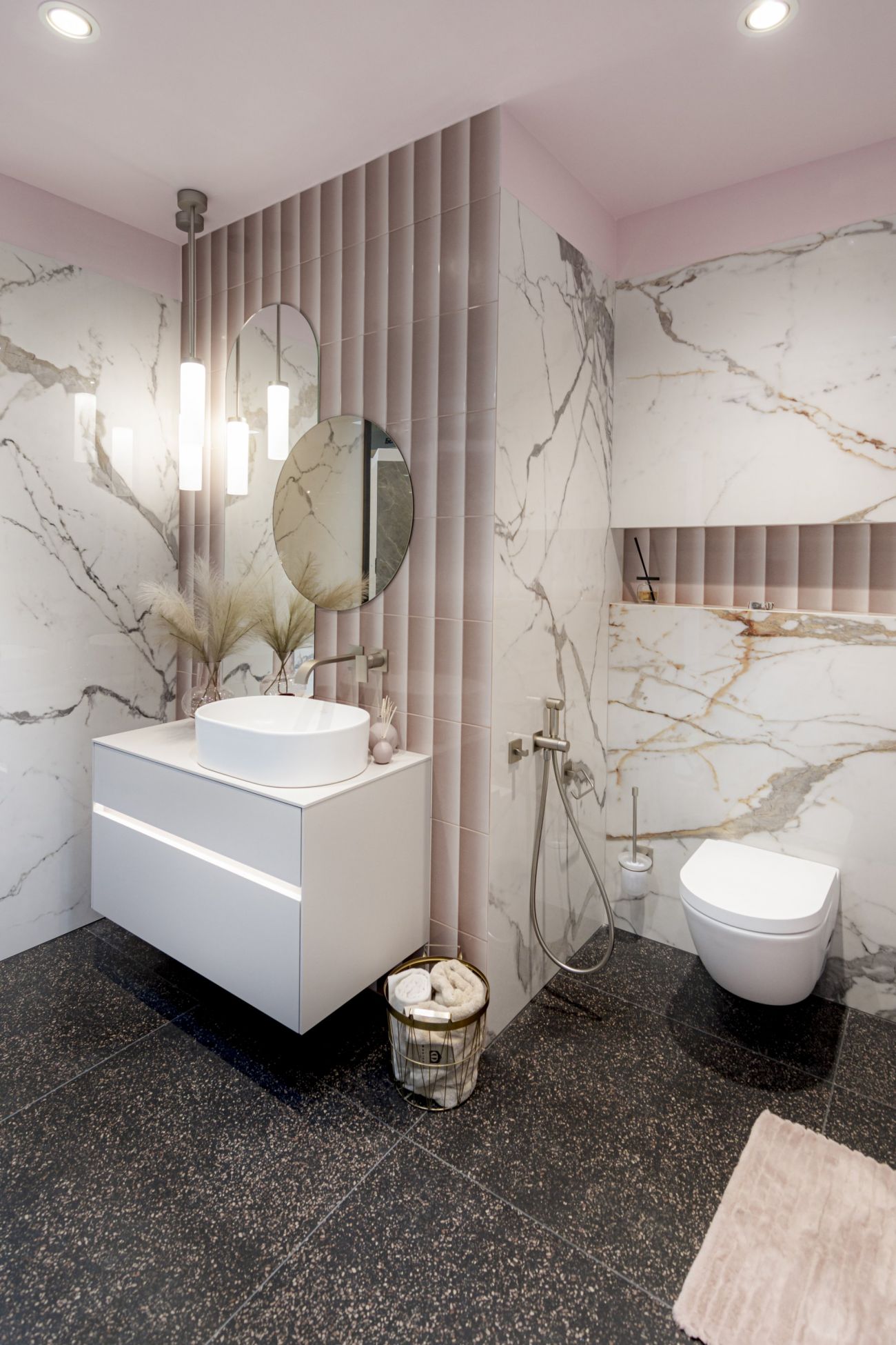 Jsou barevné stálice, které sluší každé koupelně, a pak jsou barvy, které dodají prostorům osobitost a originalitu. Důkazem je velmi elegantní koupelna v pudrově růžové barvě, která i když se na první pohled může zdát dámskou, své místo si zde najdou zajisté i muži.