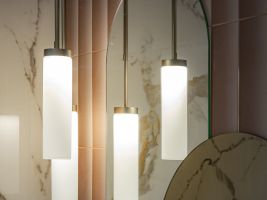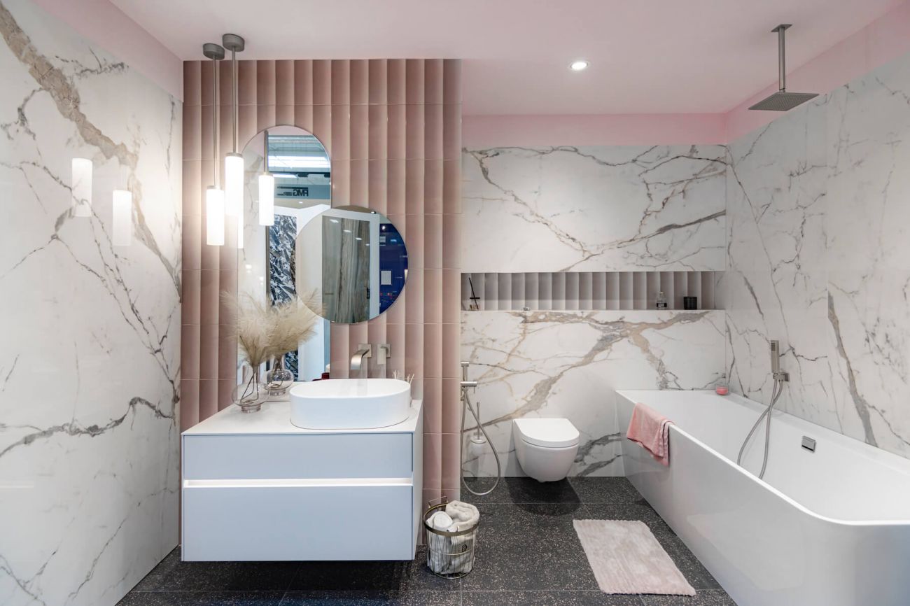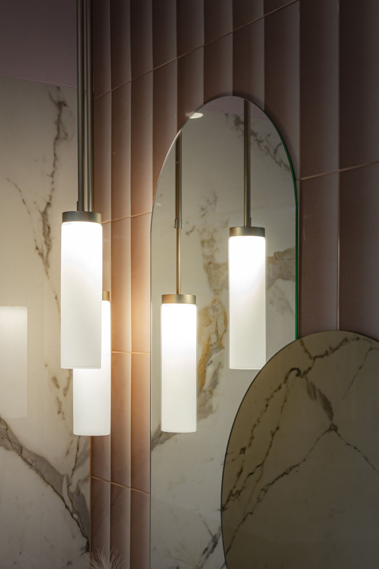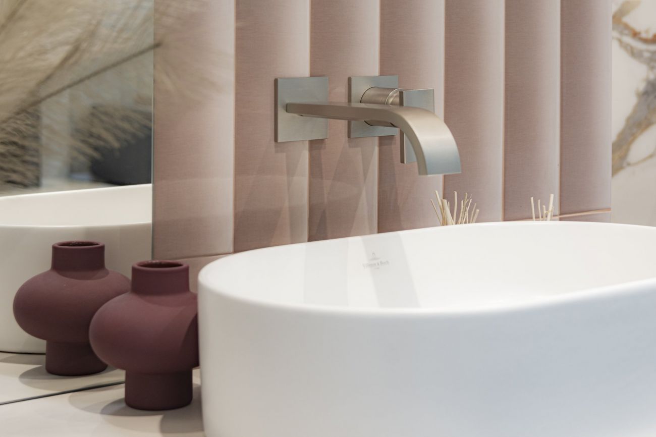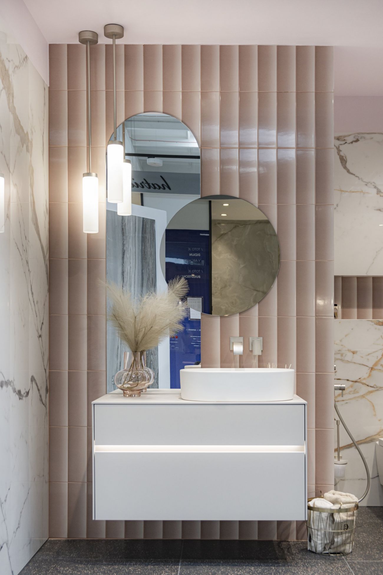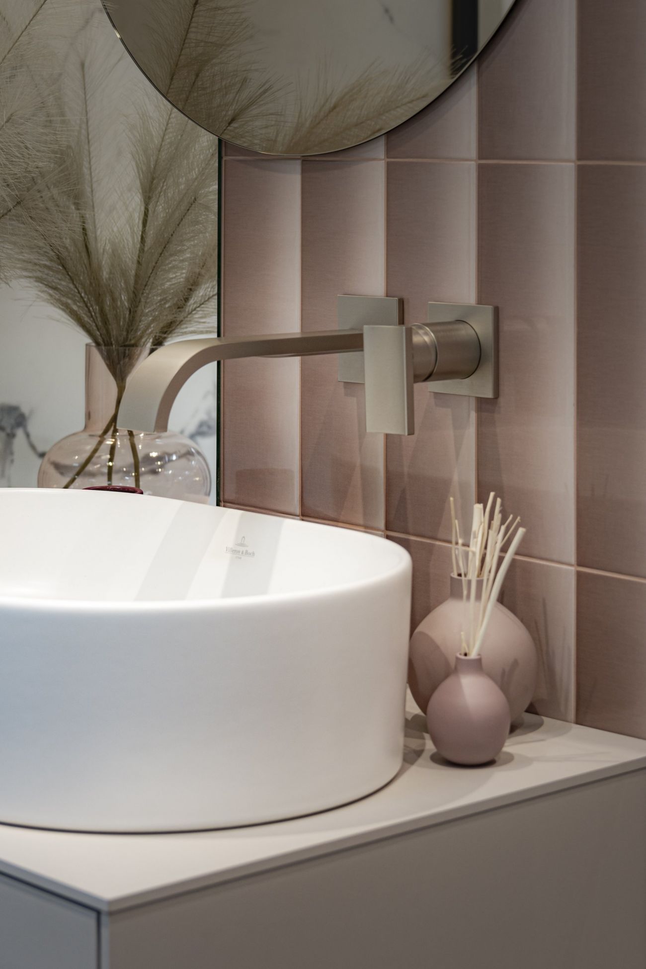 Koupelna ze série Les Origines de Rex je důkazem toho, že velkoformátové dlažbě o rozměrech 120x240 sluší i barvy. Koupelna je elegantní a zároveň něžná, a to hlavně díky dokonalému souladu barev a vzorů dlažby a obkladů, vše od renomované italské značky Florim. Na zdech je použitá pudrově růžová barva v kombinaci s tmavou podlahou v kamenném dekoru. Zajímavé je také uplatnění atypických cihliček ze série Diesel v jemně růžové barvě, které jsou s velkoformátem spojeny kamenickým rohem, což dodává celku velkou lehkost a eleganci.