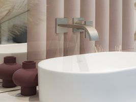 Dominantu celé koupelny je solitérní vana postavená v prostoru napouštěná přepadem. Dalším prvkem, který koupelnu dělá jemnou a elegantní jsou baterie v designu broušeného niklu.