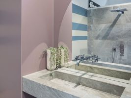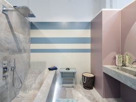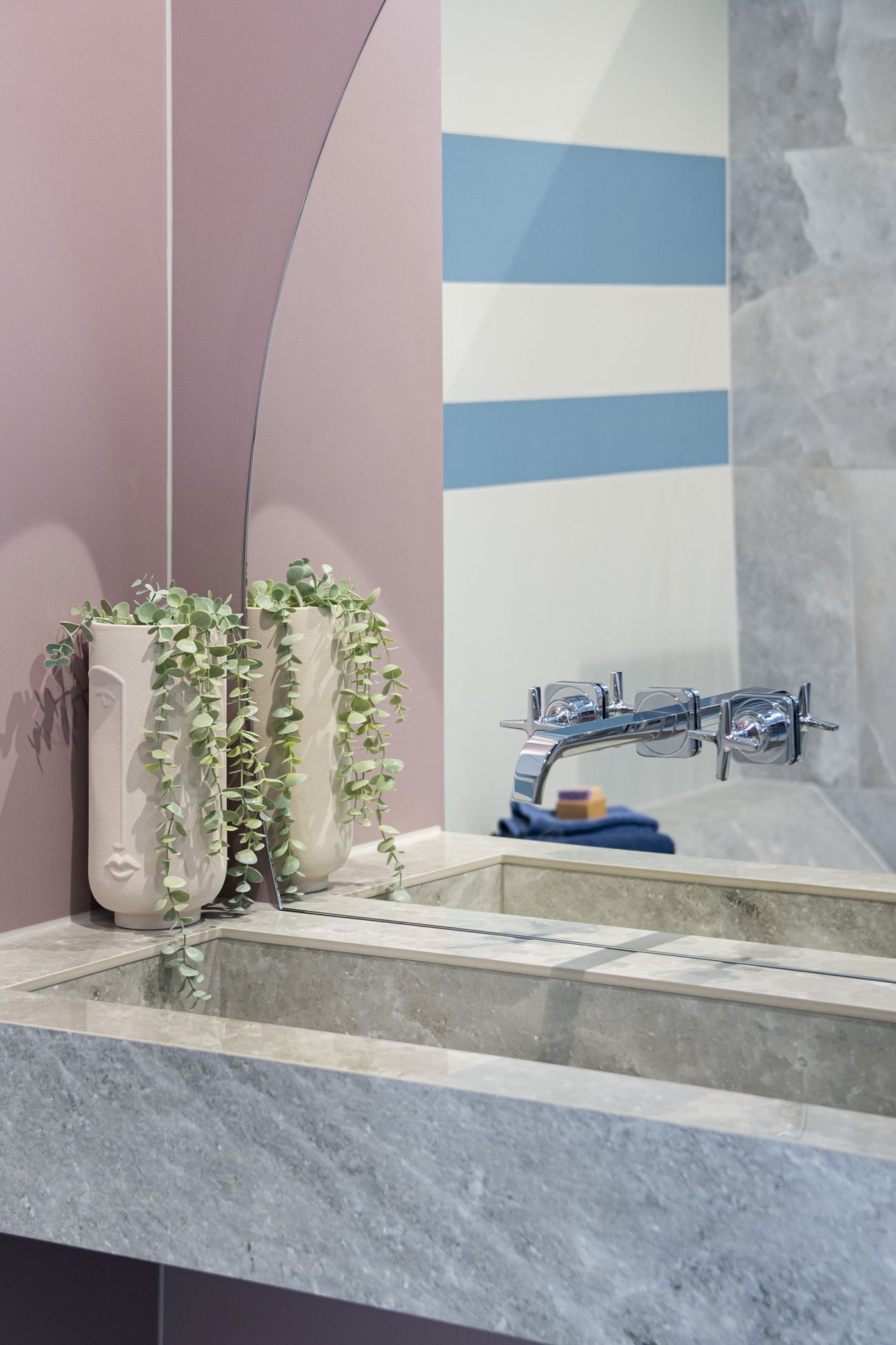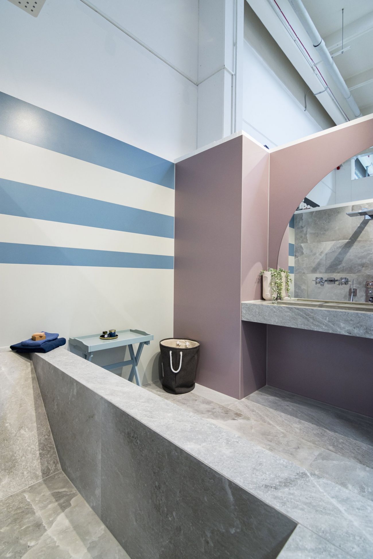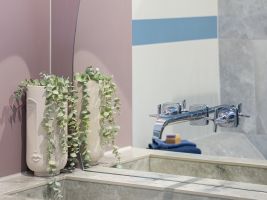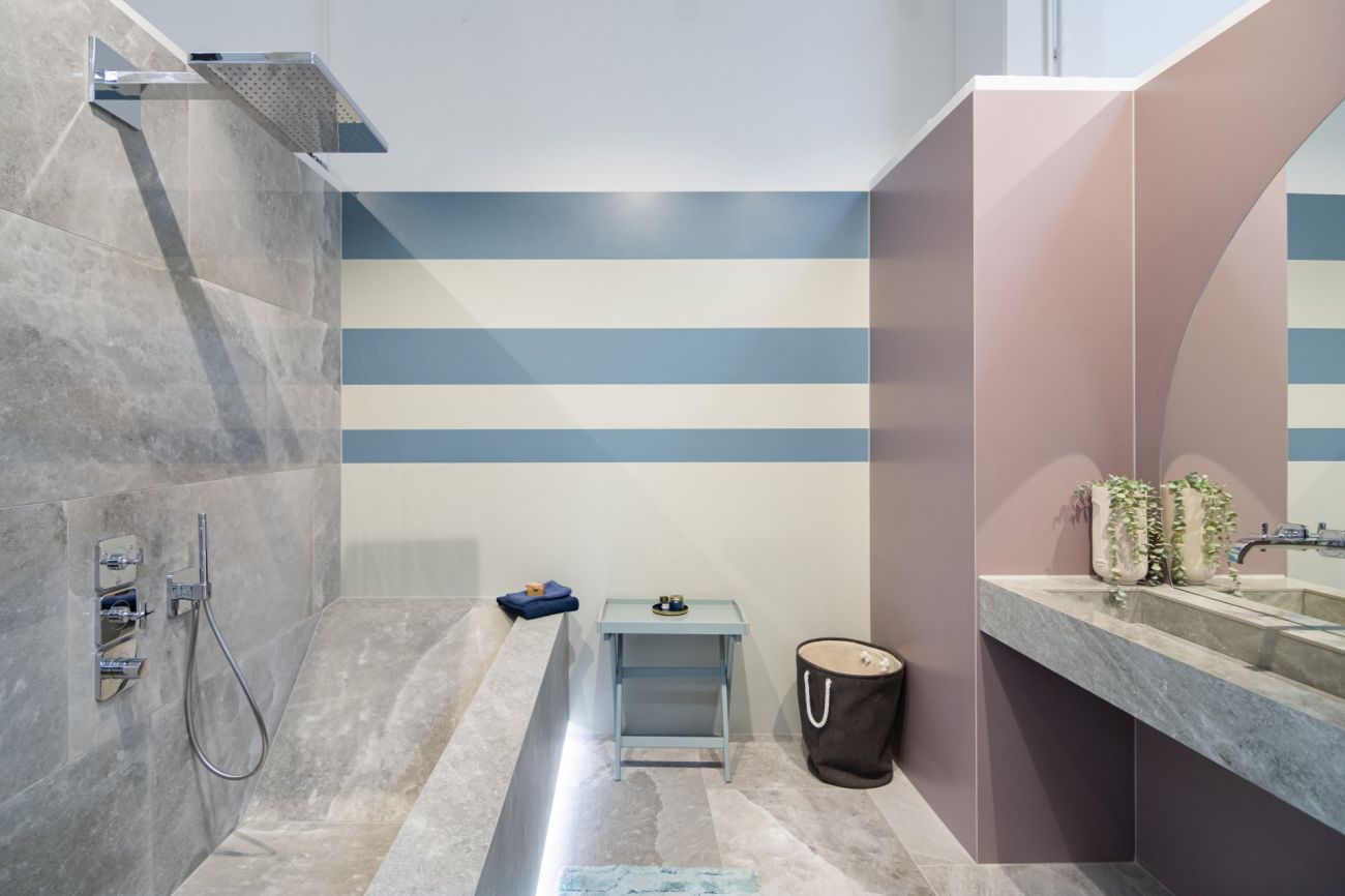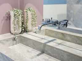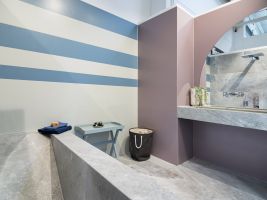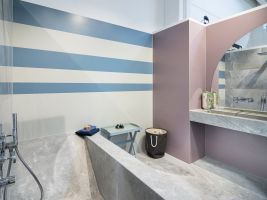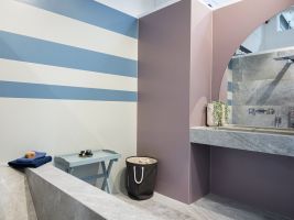 Už vás nebaví běžné styly navržených koupelen a chcete něco zcela výjimečného. Inspiraci najdete v koupelně sestavené ze sérií Rock Salt a Crayons. Jedná se totiž o naprosto neotřelou kombinaci přírodního materiálu a velkoformátových pastelových obkladů inspirovaných poválečnou architekturou. Vše je pak doplněné o zcela unikátní vanu.