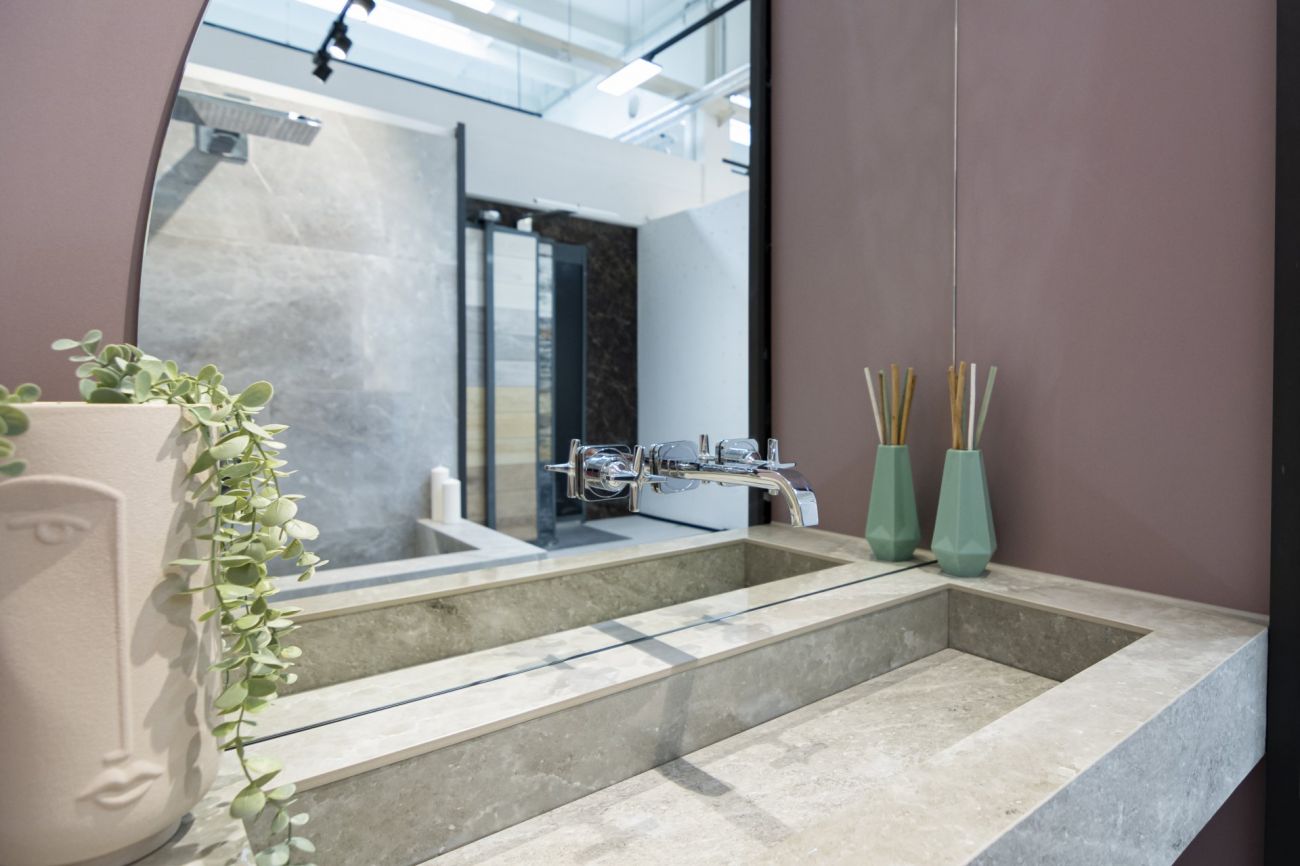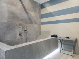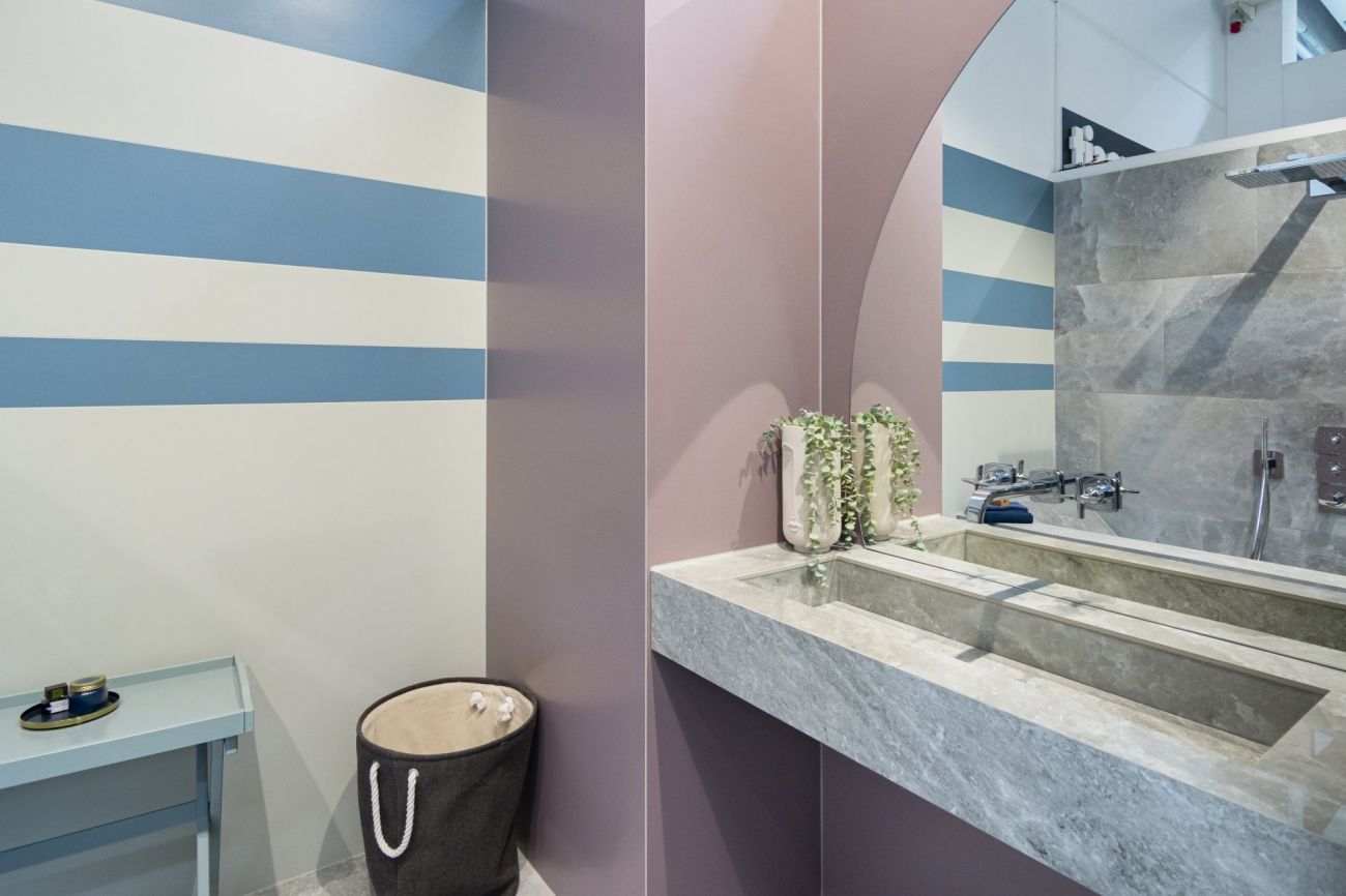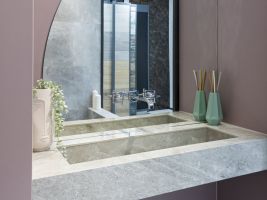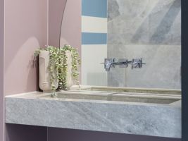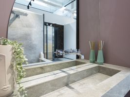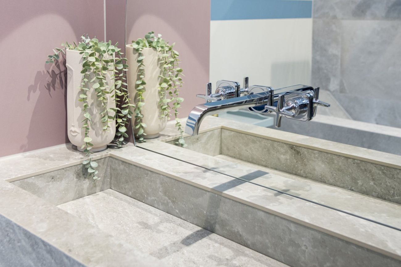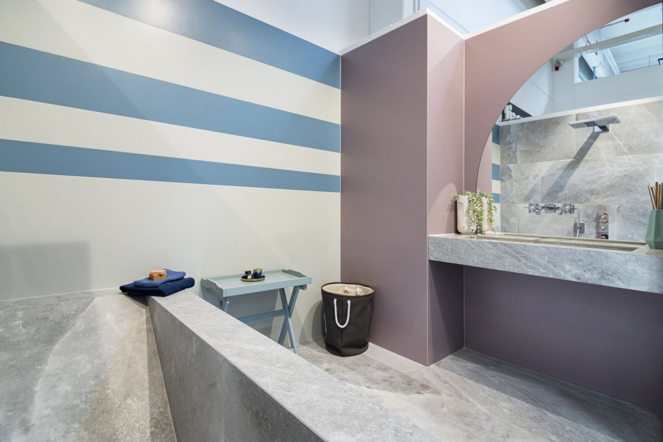 Už vás nebaví běžné styly navržených koupelen a chcete něco zcela výjimečného. Inspiraci najdete v koupelně sestavené ze sérií Rock Salt a Crayons. Jedná se totiž o naprosto neotřelou kombinaci přírodního materiálu a velkoformátových pastelových obkladů inspirovaných poválečnou architekturou. Vše je pak doplněné o zcela unikátní vanu.