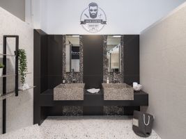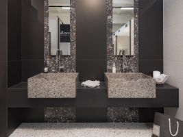 V naší koupelně je díky českému výrobnímu podniku TechnoArt vyrobena výjimečná deska pod umyvadla, která umocňuje celkový charakter koupelny. Možná je ale výroba i dalších doplňků z této série, jako jsou poličky či stolky.