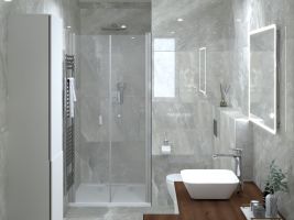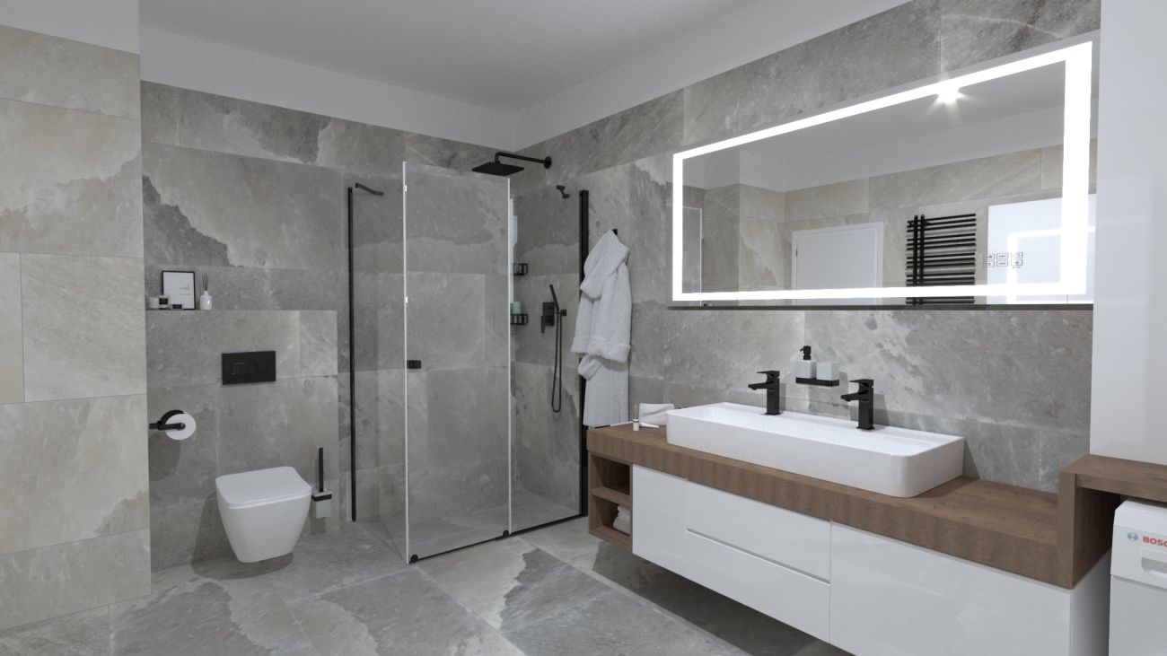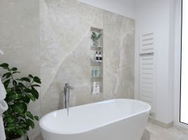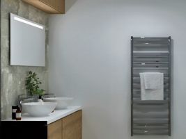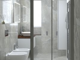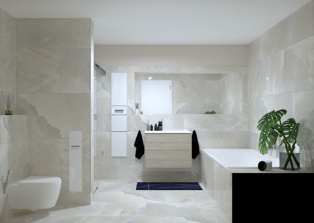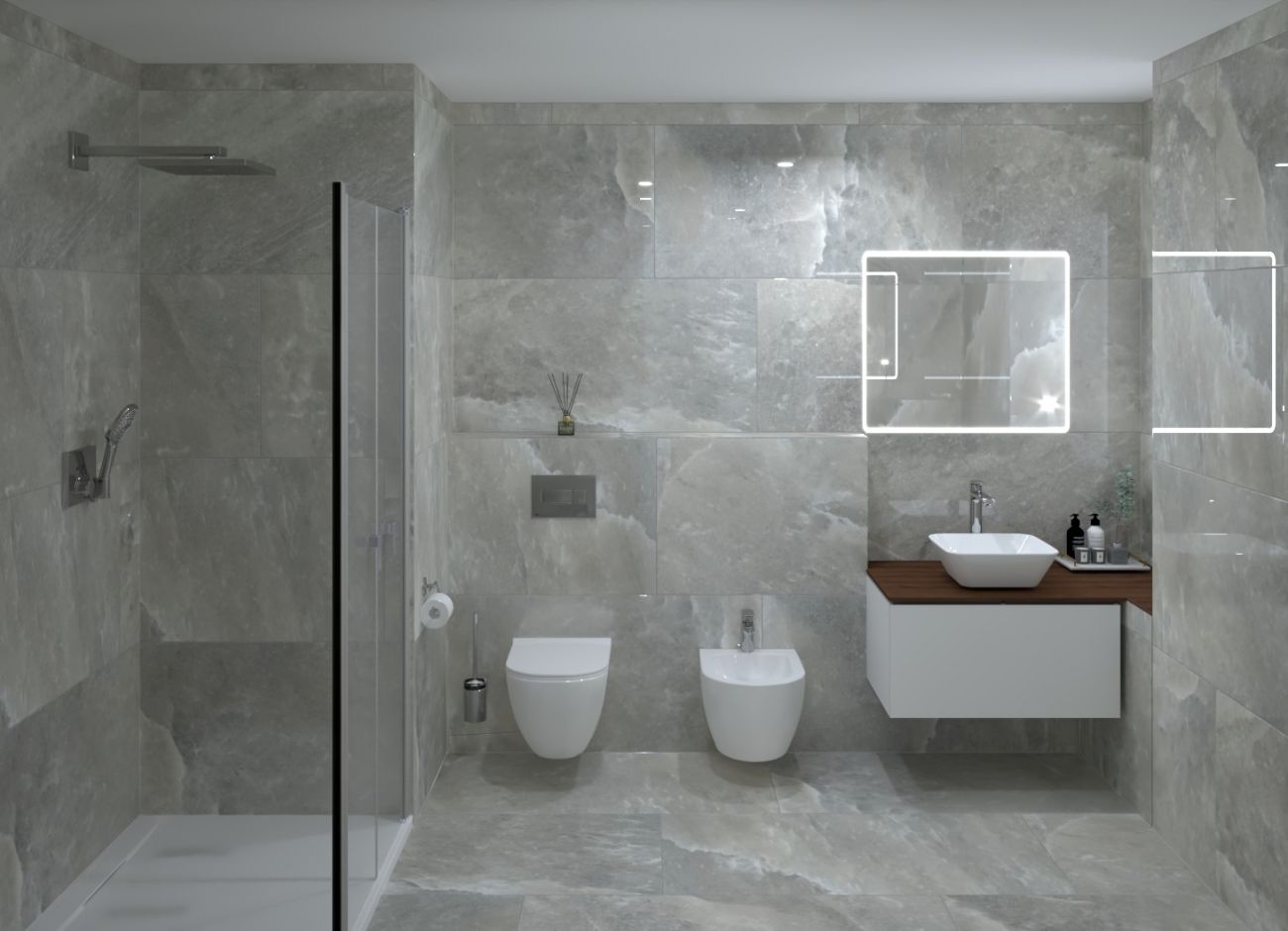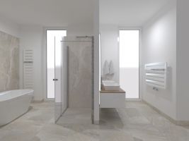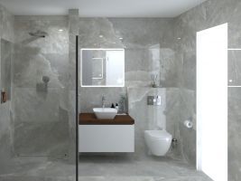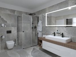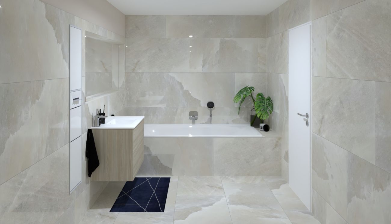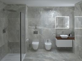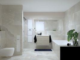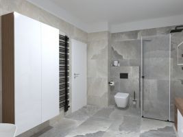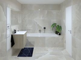 Zcela výjimečná je na této sérii hluboká kresba s atmosférou přírodního kamene a také na omak je cítit struktura povrchu. Do této koupelny se hodí doplňky jako zapuštěné dvoukřídlé zrcadlo s podsvícením, skříňka schovaná ve zdi či celokeramické umyvadlo s otevřeným úložným prostorem, což dodává celé koupelně originalitu. Krásně zde vynikne i designový radiátor. Čisté linie koupelně dodávají zápustné moduly v podobě skříněk na toaletní papír či štětku na záchod. Je to velmi designová ale i hygienická záležitost.
