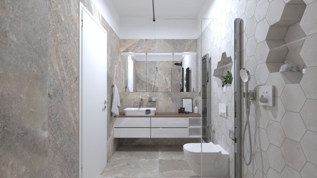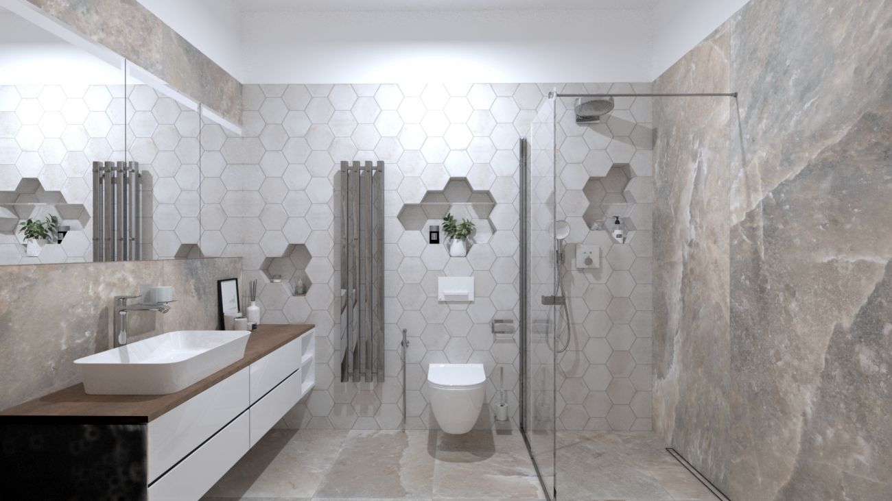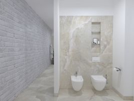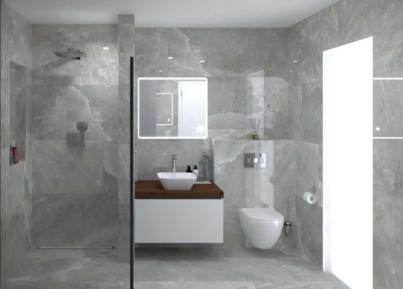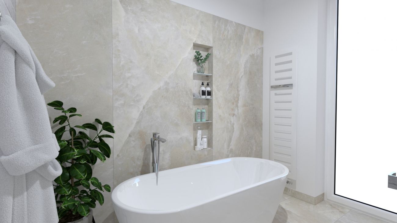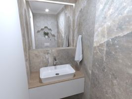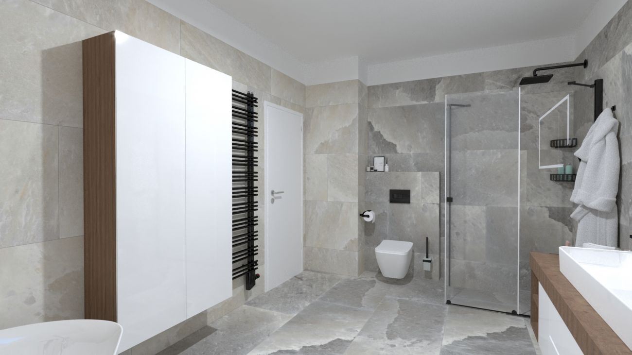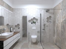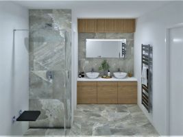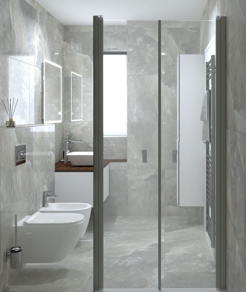 Zcela výjimečná je na této sérii hluboká kresba s atmosférou přírodního kamene a také na omak je cítit struktura povrchu. Do této koupelny se hodí doplňky jako zapuštěné dvoukřídlé zrcadlo s podsvícením, skříňka schovaná ve zdi či celokeramické umyvadlo s otevřeným úložným prostorem, což dodává celé koupelně originalitu. Krásně zde vynikne i designový radiátor. Čisté linie koupelně dodávají zápustné moduly v podobě skříněk na toaletní papír či štětku na záchod. Je to velmi designová ale i hygienická záležitost.