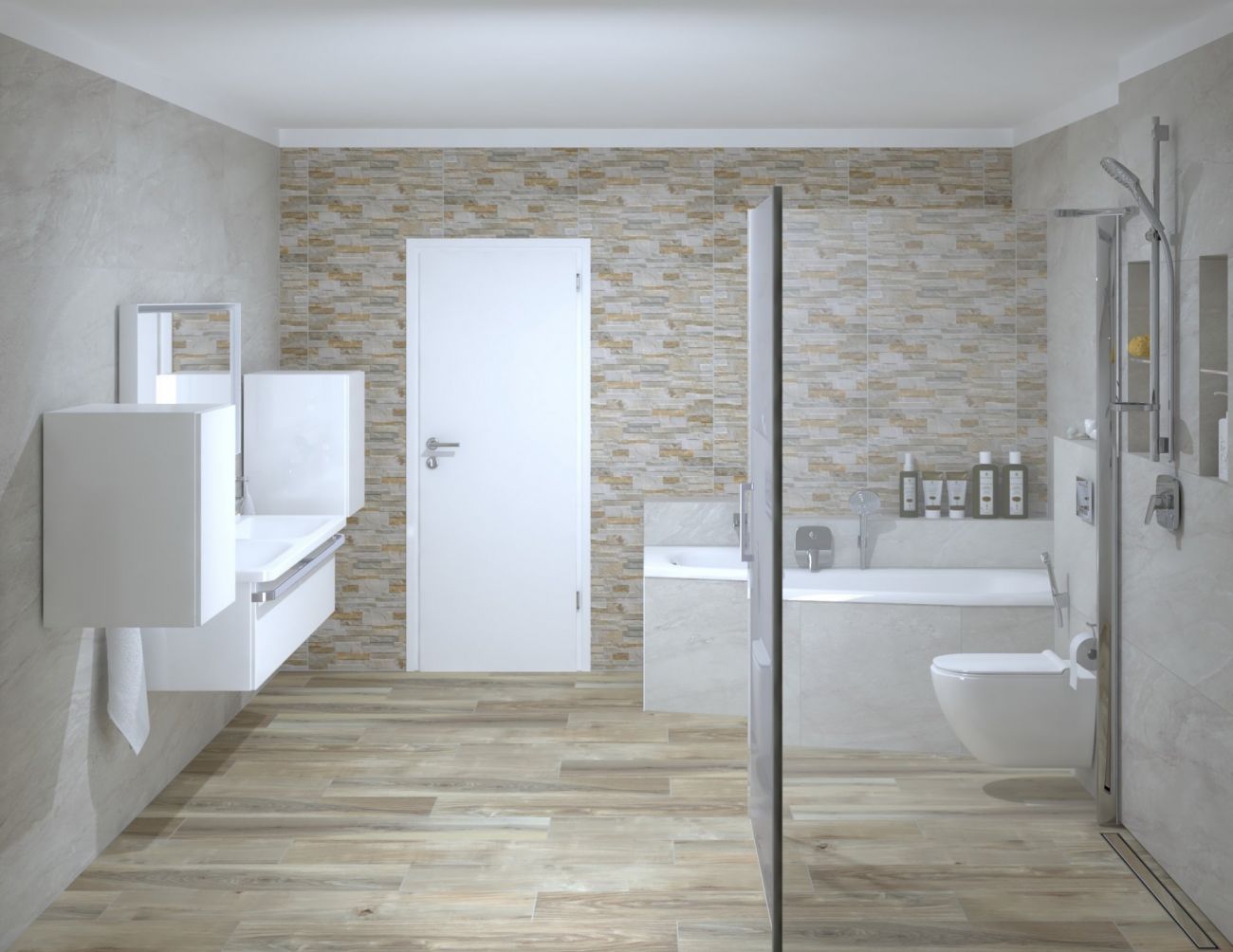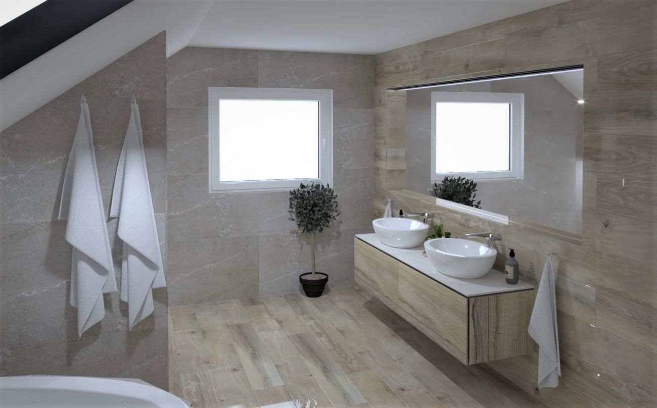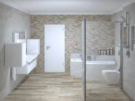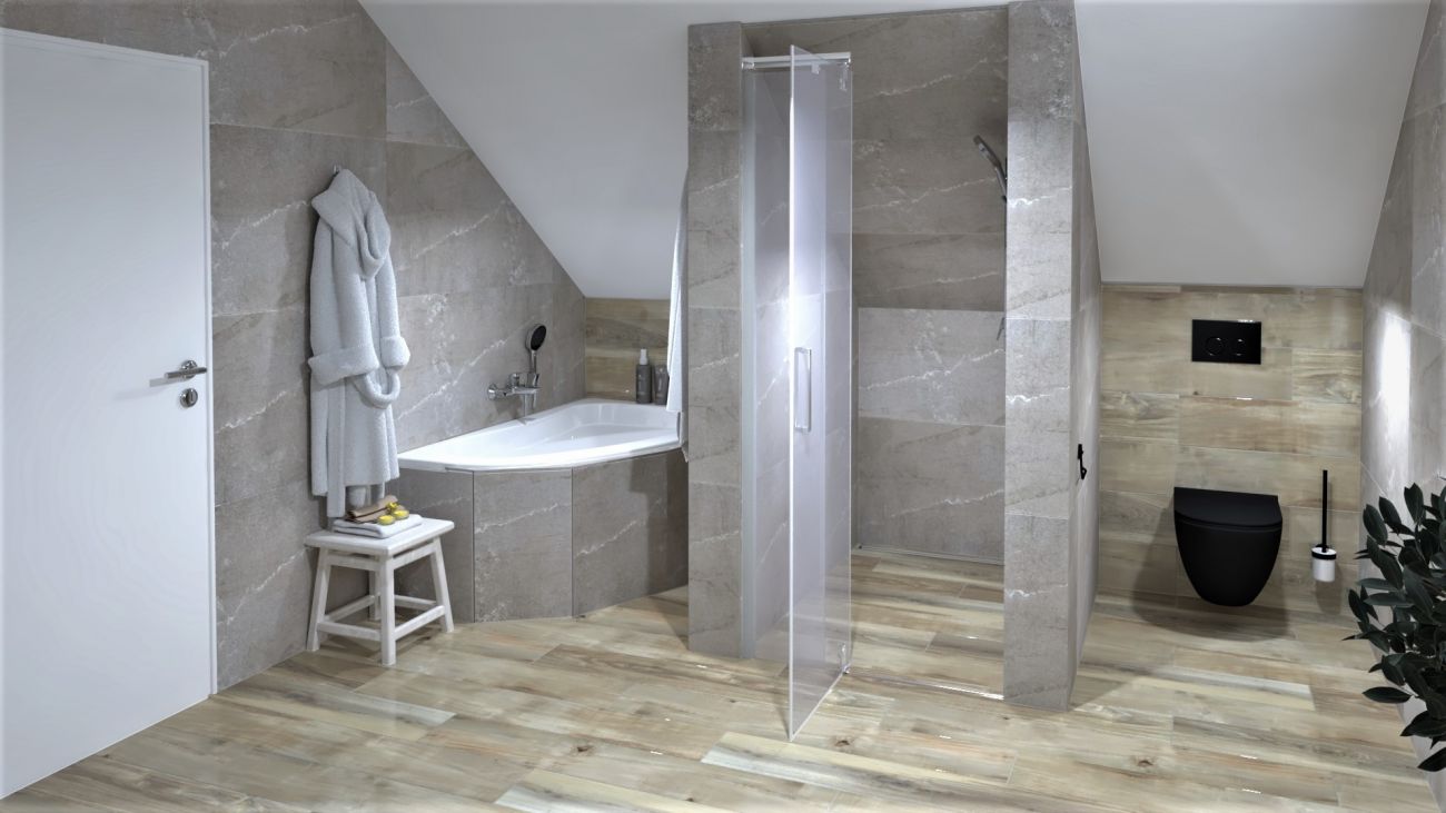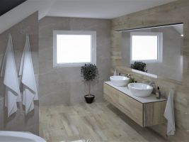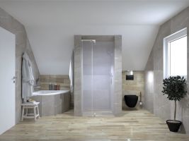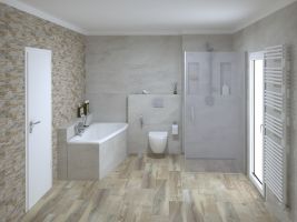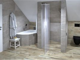 Koupelny se vzorem jemné kameniny a s dekorem dřeva