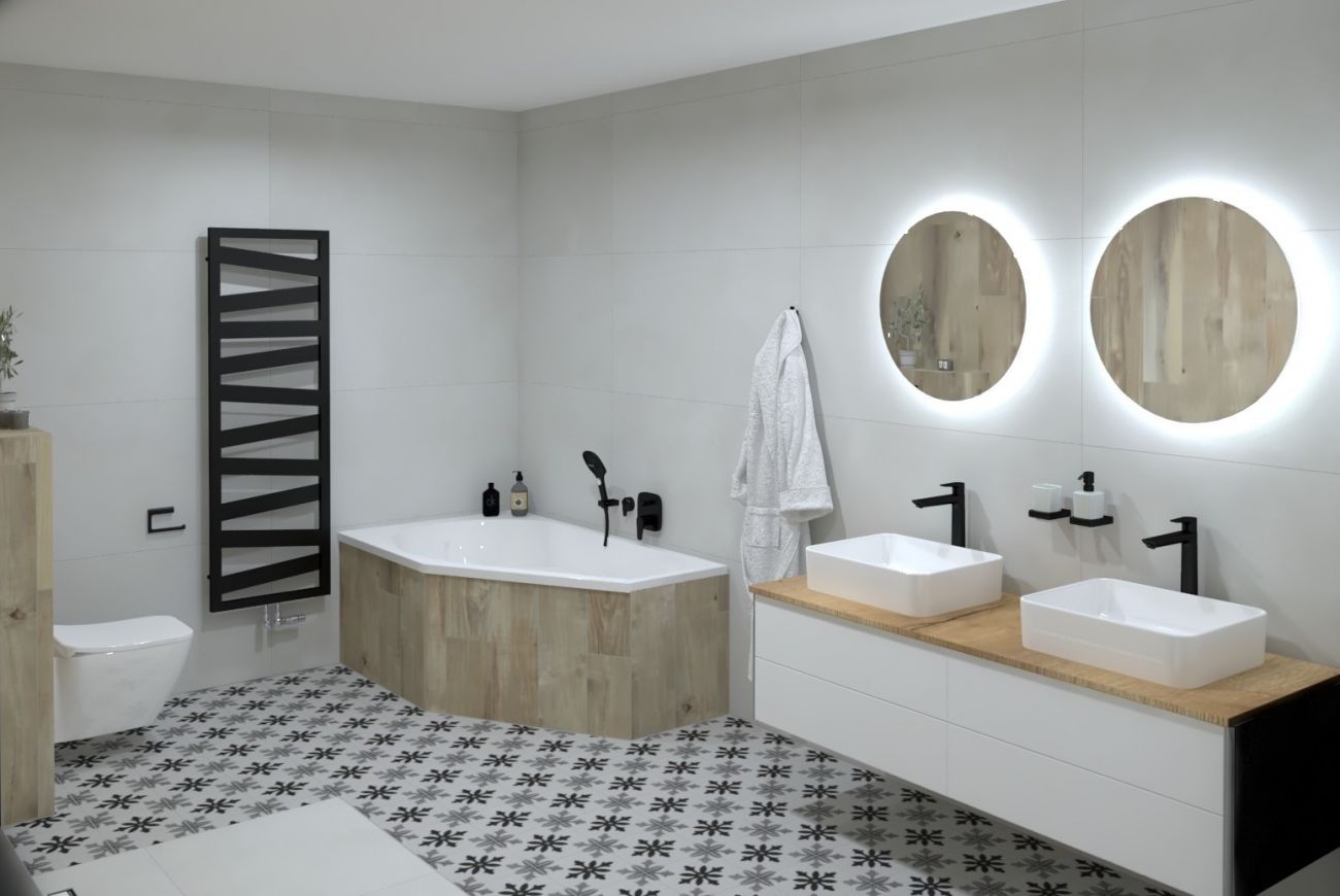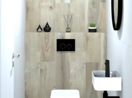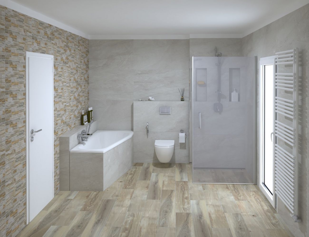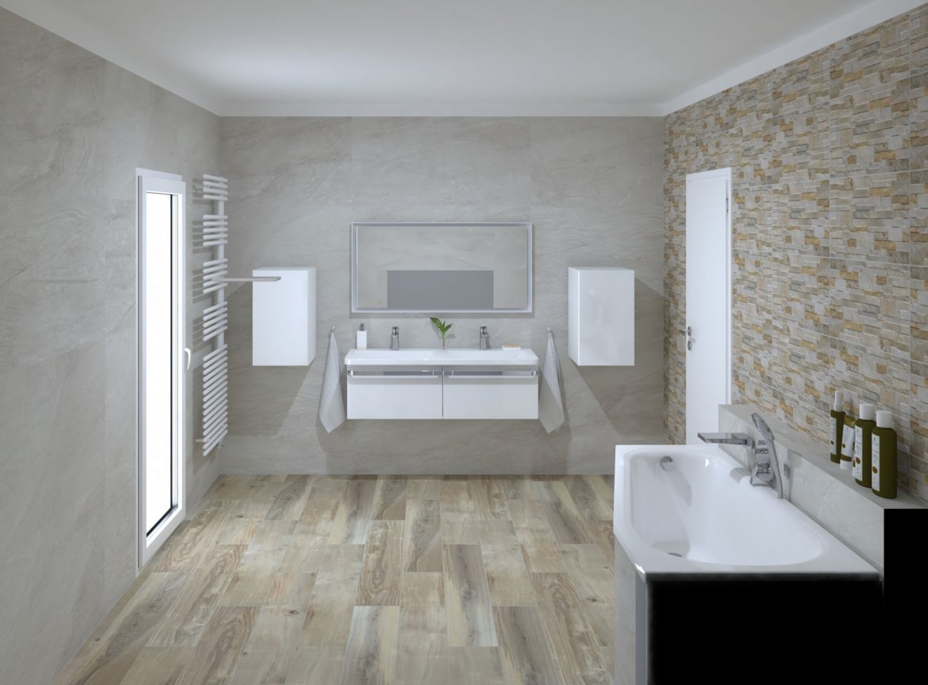 Koupelny se vzorem jemné kameniny a s dekorem dřeva