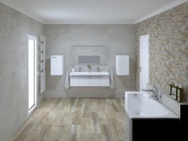 Koupelnám stále vládnou přírodní barvy a materiály. Při vhodné kombinaci z nich vykouzlíte elegantní a vkusné místo. Například dlaždice série Elemental Stone v kombinaci s dlaždicemi Hi-Wood jsou zárukou čistých a elegantních linií. Jedná se o souhru jemné kameniny s velkými zrny a dřevodekorem dlažby. Tato kombinace je mezi zákazníky velmi vyhledávaná pro svůj přirozený vzhled a nadčasovost.