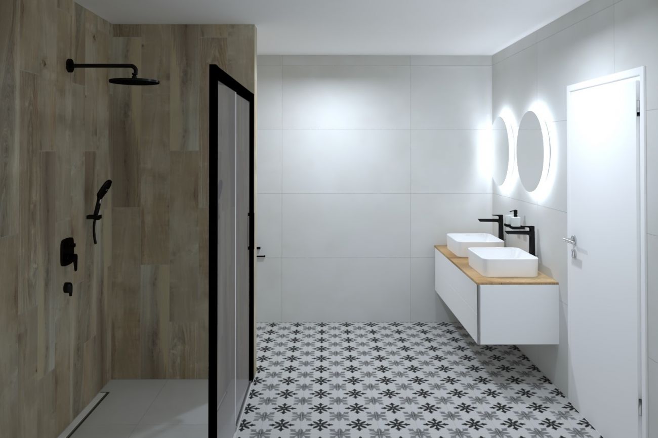 Kombinace dlažeb se hodí do koupelen různých prostorů, v malých koupelnách působí velmi stylově a útulně.