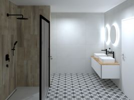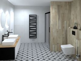 Pro kombinaci dlažby Elemental Stone s dlaždicemi Hi-Wood můžete zvolit libovolný systém, dle vašeho vkusu. Tato oblíbená kombinace totiž nabízí nespočet možností, jak ji v koupelně poskládat. Jedná se o velmi elegantní a nadčasovou koupelnu, kterou je vhodné doplnit zajímavými doplňky, tak aby celek působil výrazně.