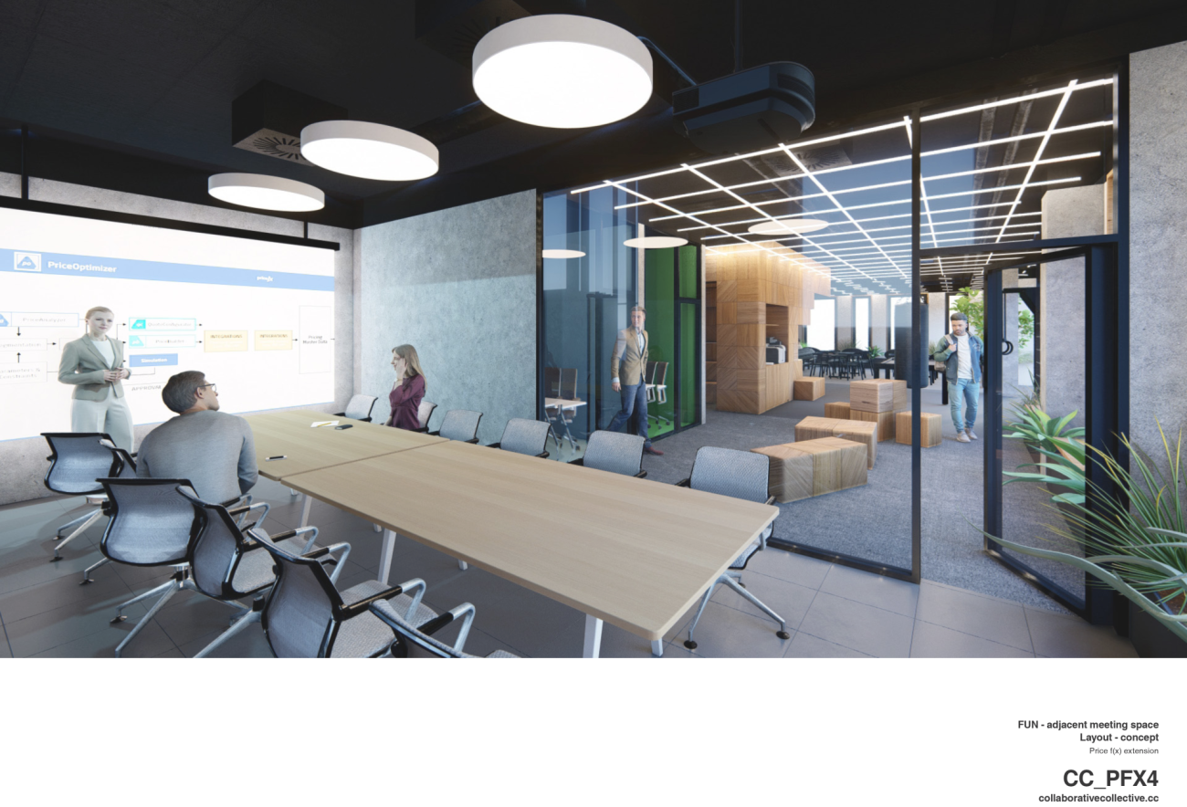 „Původní kanceláře zabíraly dvě patra v administrativní budově. Horní patro zůstává v původním dispozičním rozvržení. Zcela nové bude ale spodní patro. Hlavní myšlenka byla vytvořit velkou konferenční místnost pro 50 lidí. Obě patra pak bude propojovat nové schodiště se skluzavkou,“ říká Tereza Jarošová, office manager společnosti Pricefx.