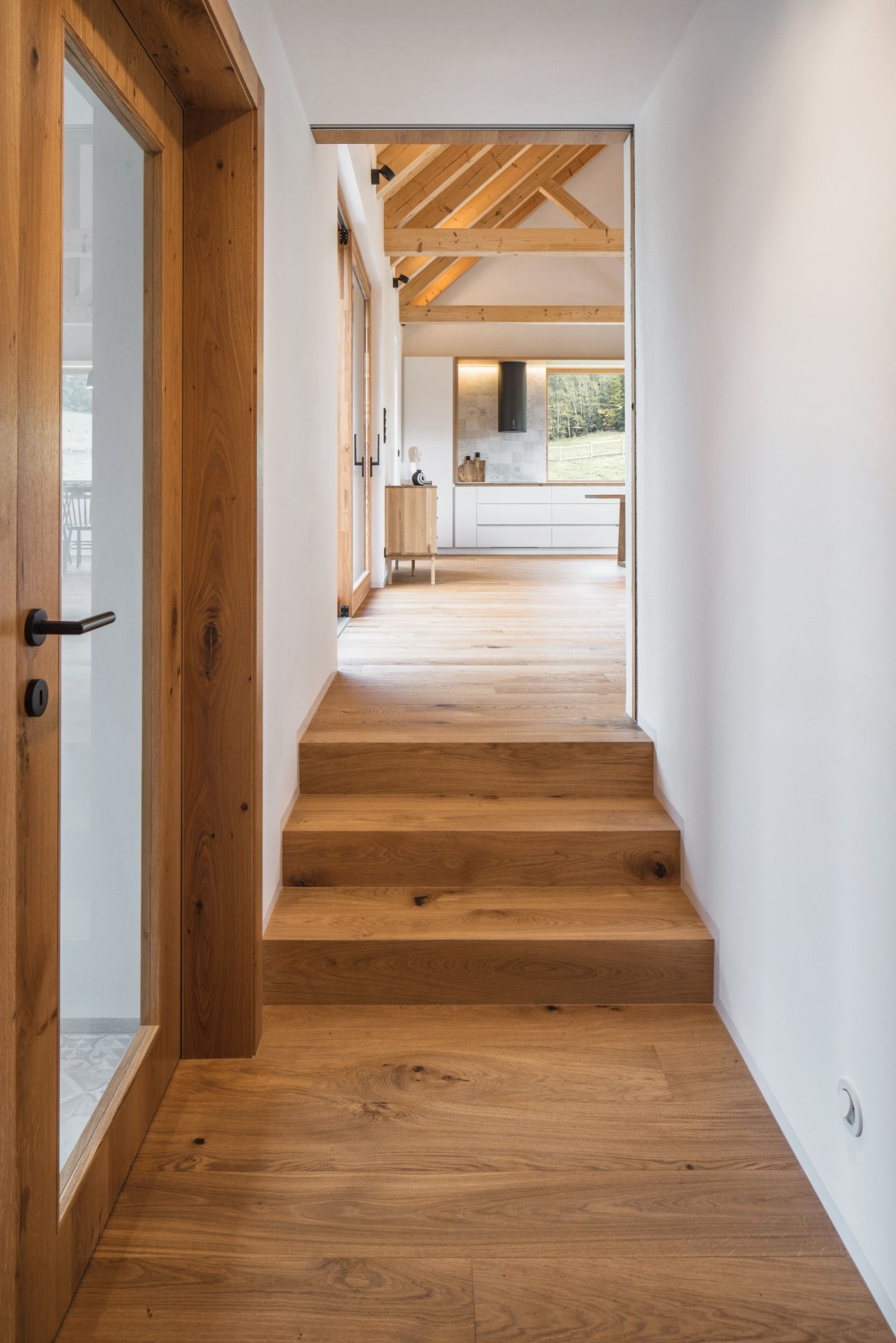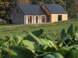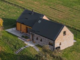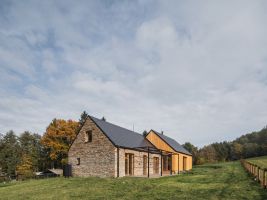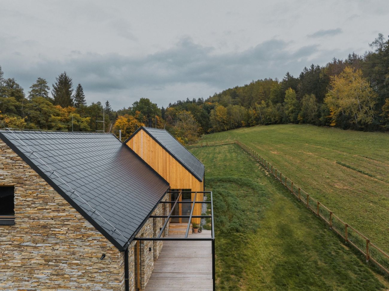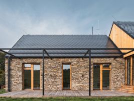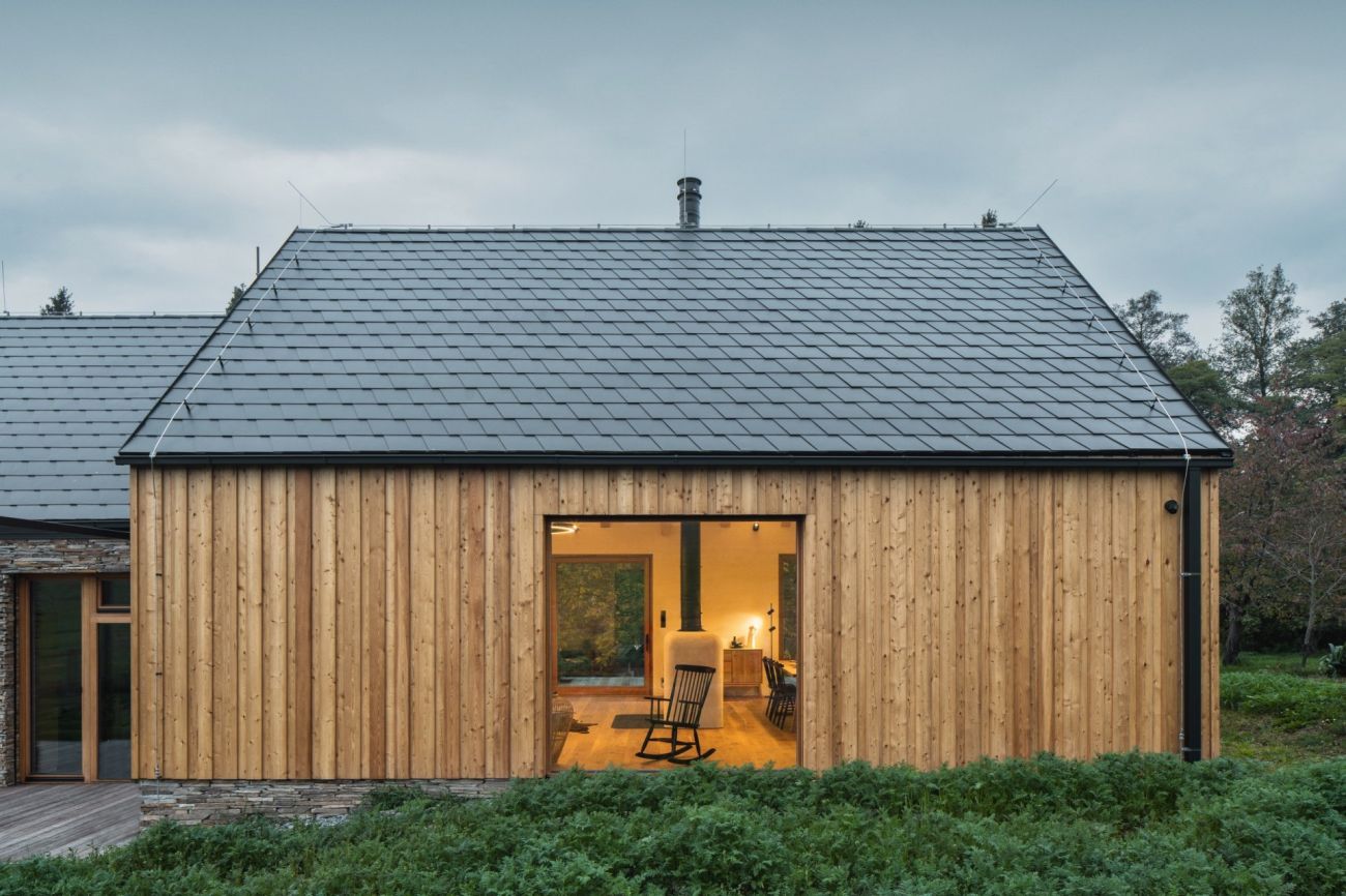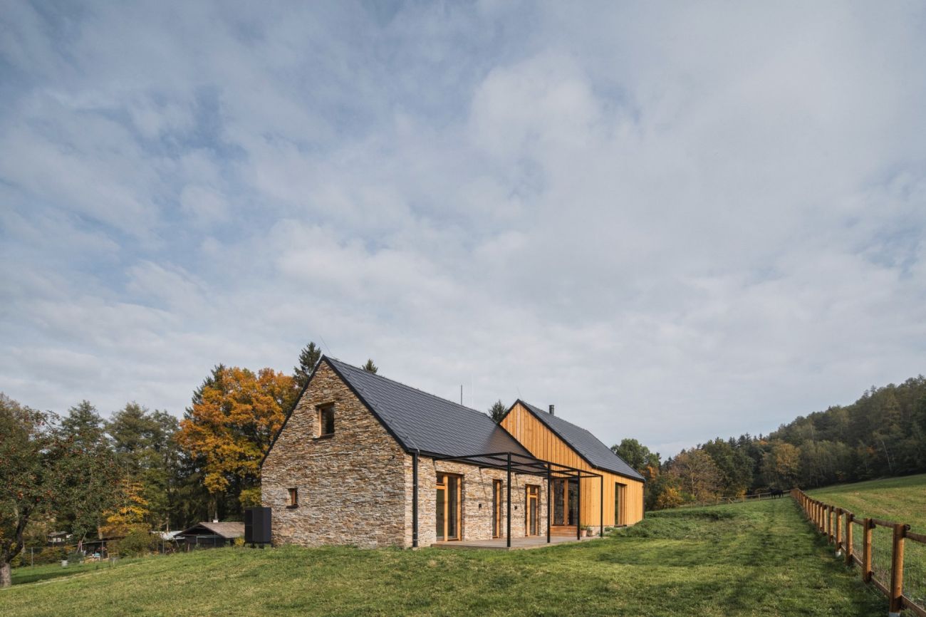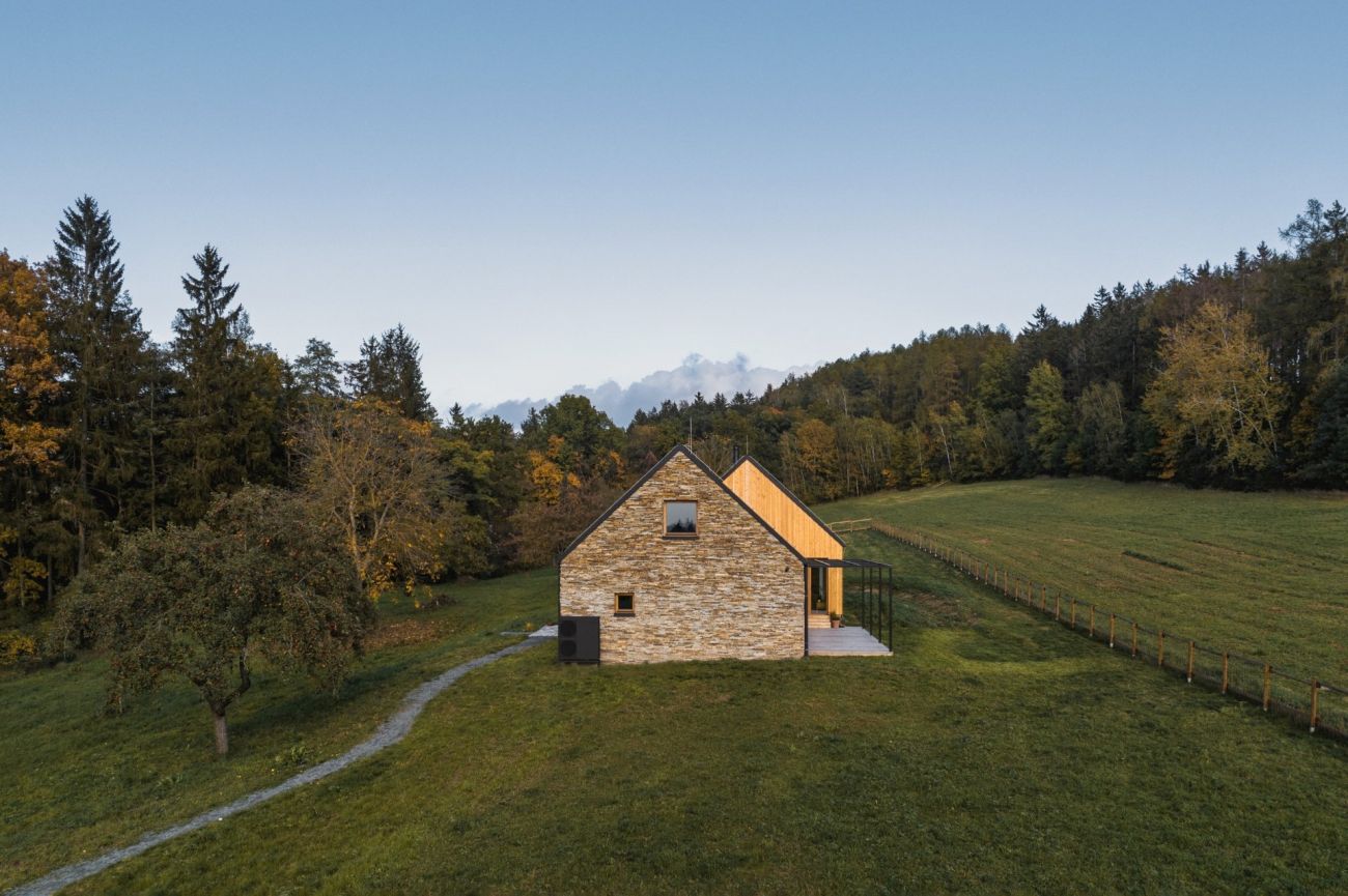 Dva objemy domu jsou přiznané i ve volbě materiálů fasády. Ta k lesu je obložená prkny ze sibiřského modřínu, ta k vesnici je pak celá kamenná.
