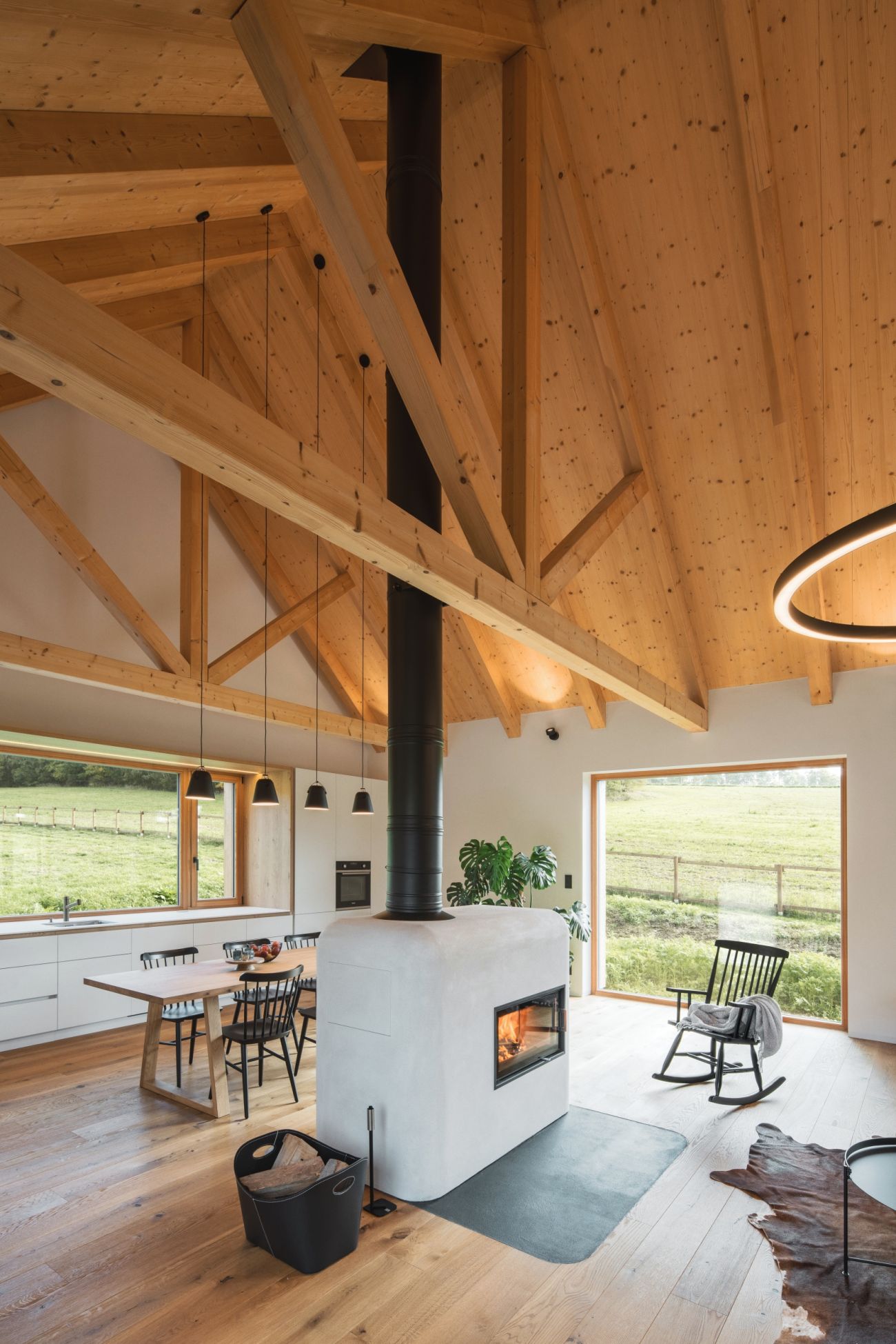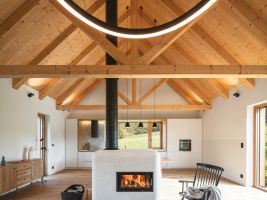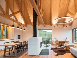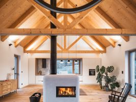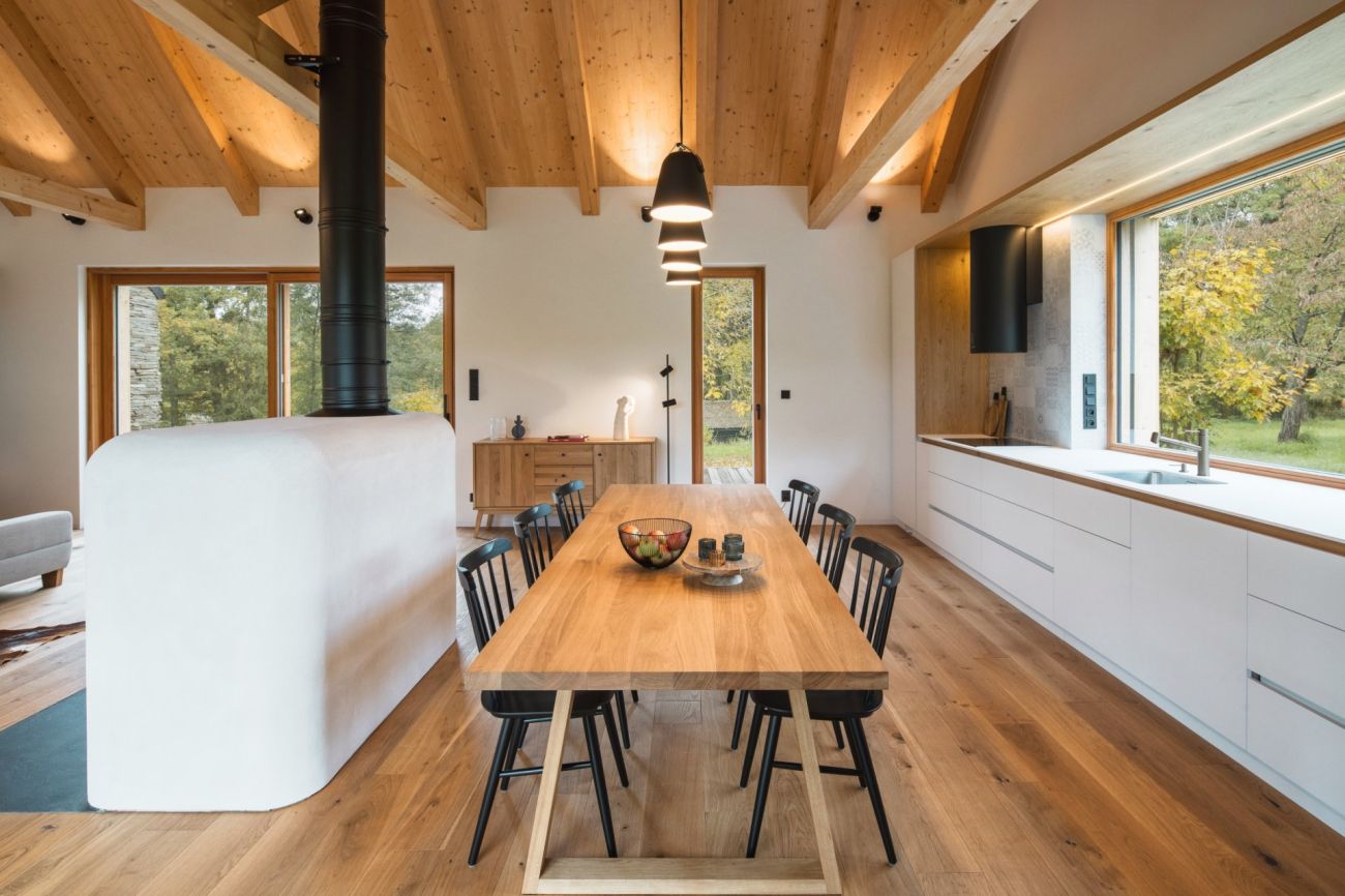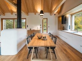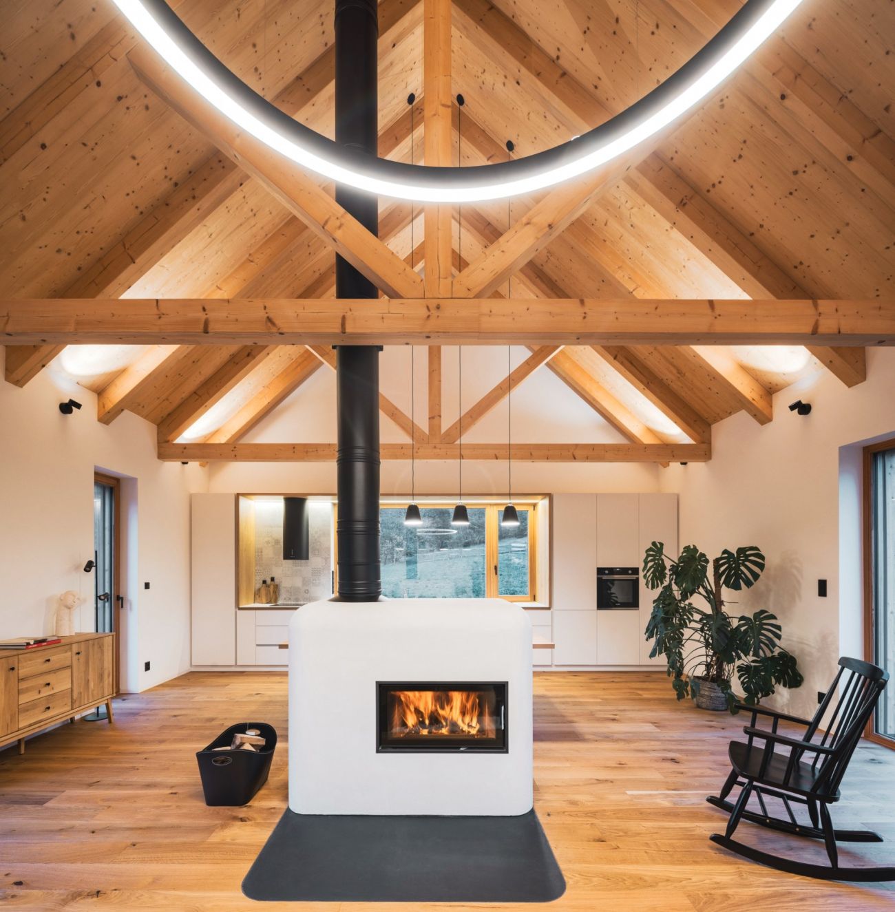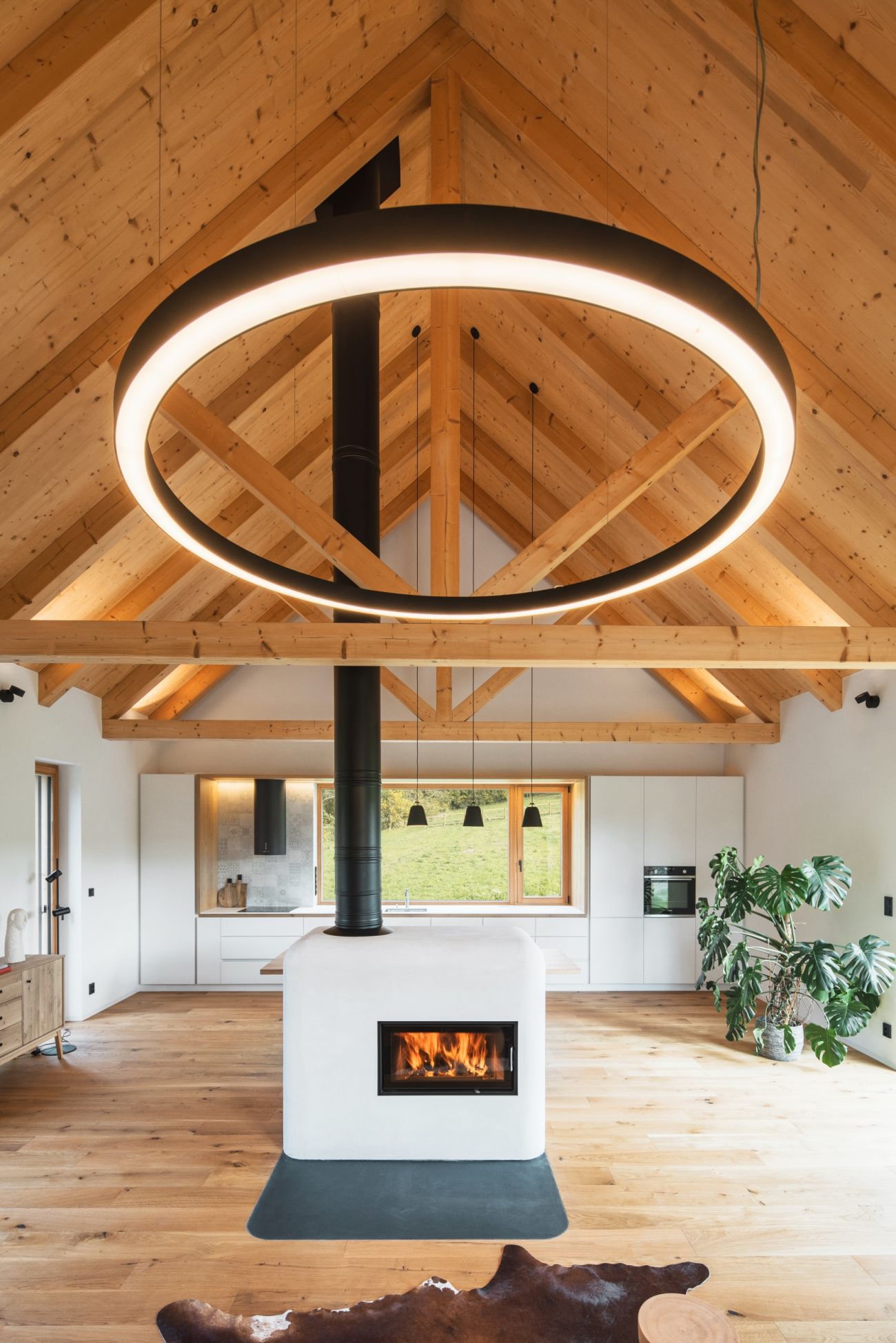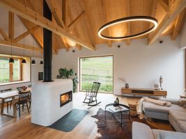 Srdce domu tvoří velký obývací pokoj s kuchyní, který je celý otevřený do krovu. Nejvýraznějším prvkem zde jsou akumulační kamna, díky kterým je v celém prostoru příjemné teplo. „Jedná se o akumulační krb, který funguje na principu starých kamen, to znamená, že i když jste zrovna přestali přikládat, sálavé teplo ještě několik hodin v domě přetrvá,“ doplňuje Lukáš Janout.