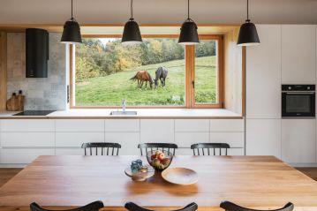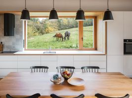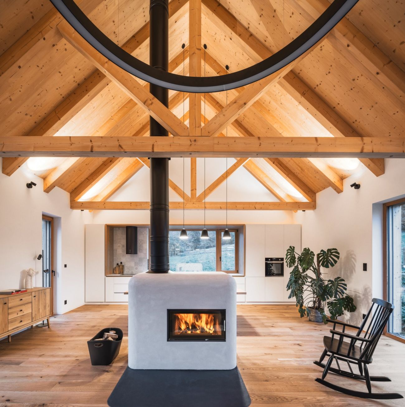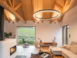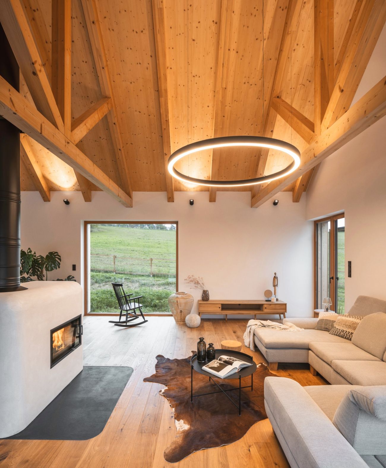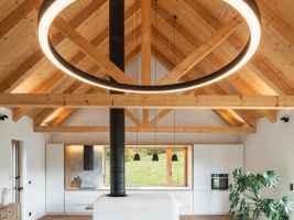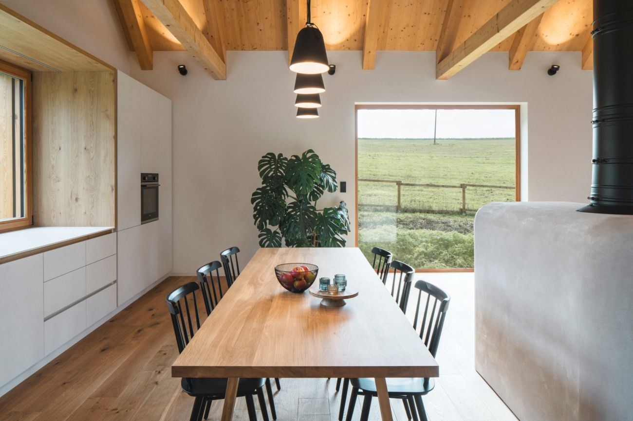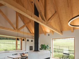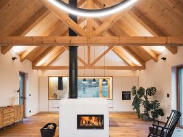 Srdce domu tvoří velký obývací pokoj s kuchyní, který je celý otevřený do krovu. Nejvýraznějším prvkem zde jsou akumulační kamna, díky kterým je v celém prostoru příjemné teplo. „Jedná se o akumulační krb, který funguje na principu starých kamen, to znamená, že i když jste zrovna přestali přikládat, sálavé teplo ještě několik hodin v domě přetrvá,“ doplňuje Lukáš Janout.