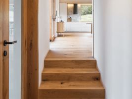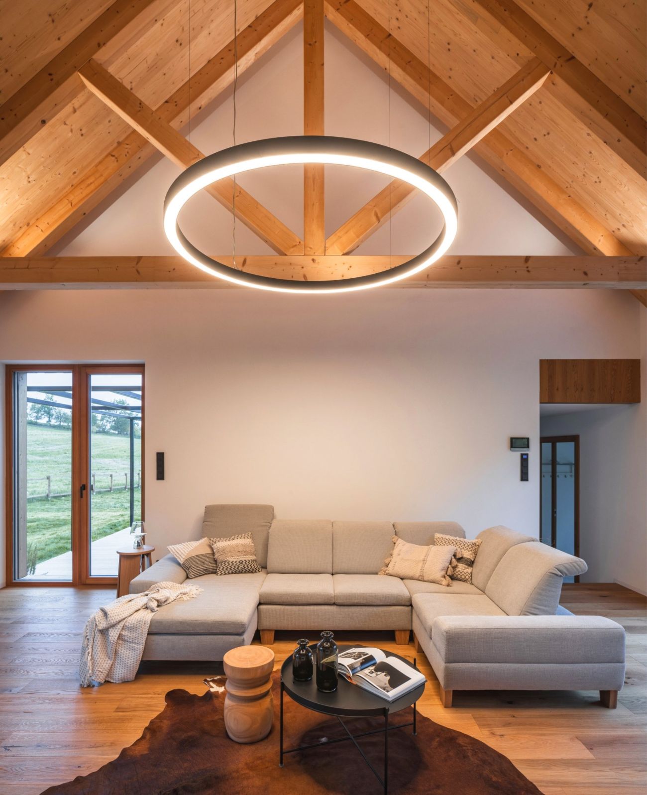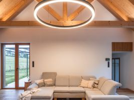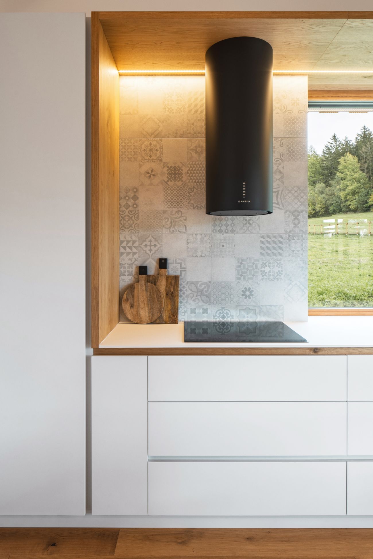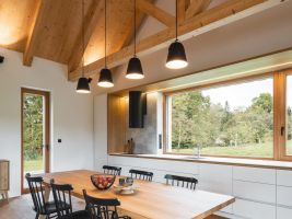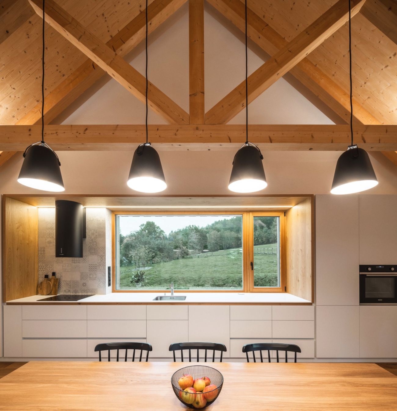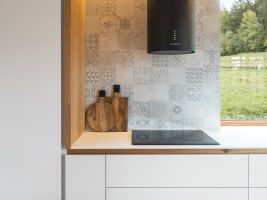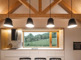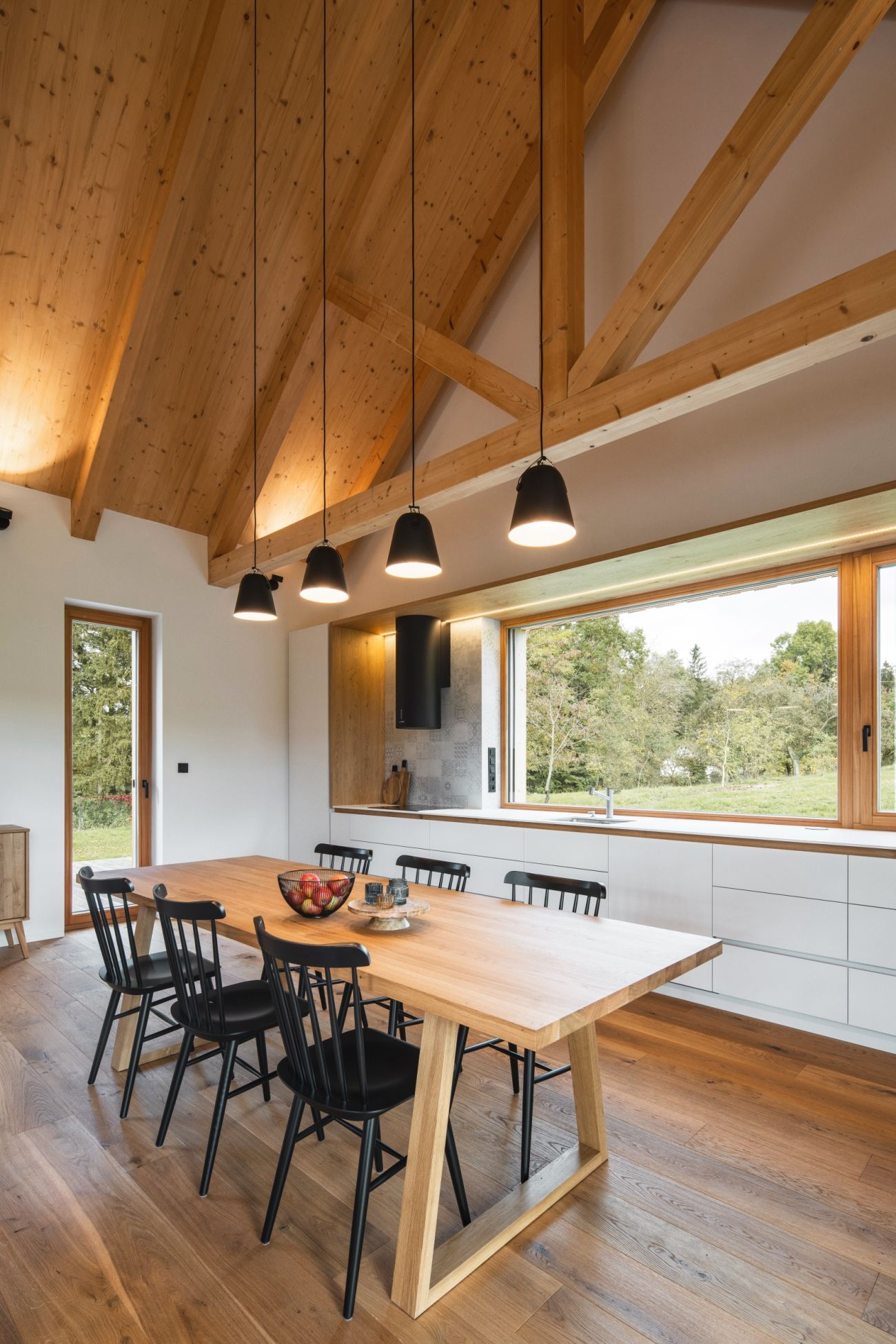 Srdce domu tvoří velký obývací pokoj s kuchyní, který je celý otevřený do krovu. Nejvýraznějším prvkem zde jsou akumulační kamna, díky kterým je v celém prostoru příjemné teplo. „Jedná se o akumulační krb, který funguje na principu starých kamen, to znamená, že i když jste zrovna přestali přikládat, sálavé teplo ještě několik hodin v domě přetrvá,“ doplňuje Lukáš Janout.