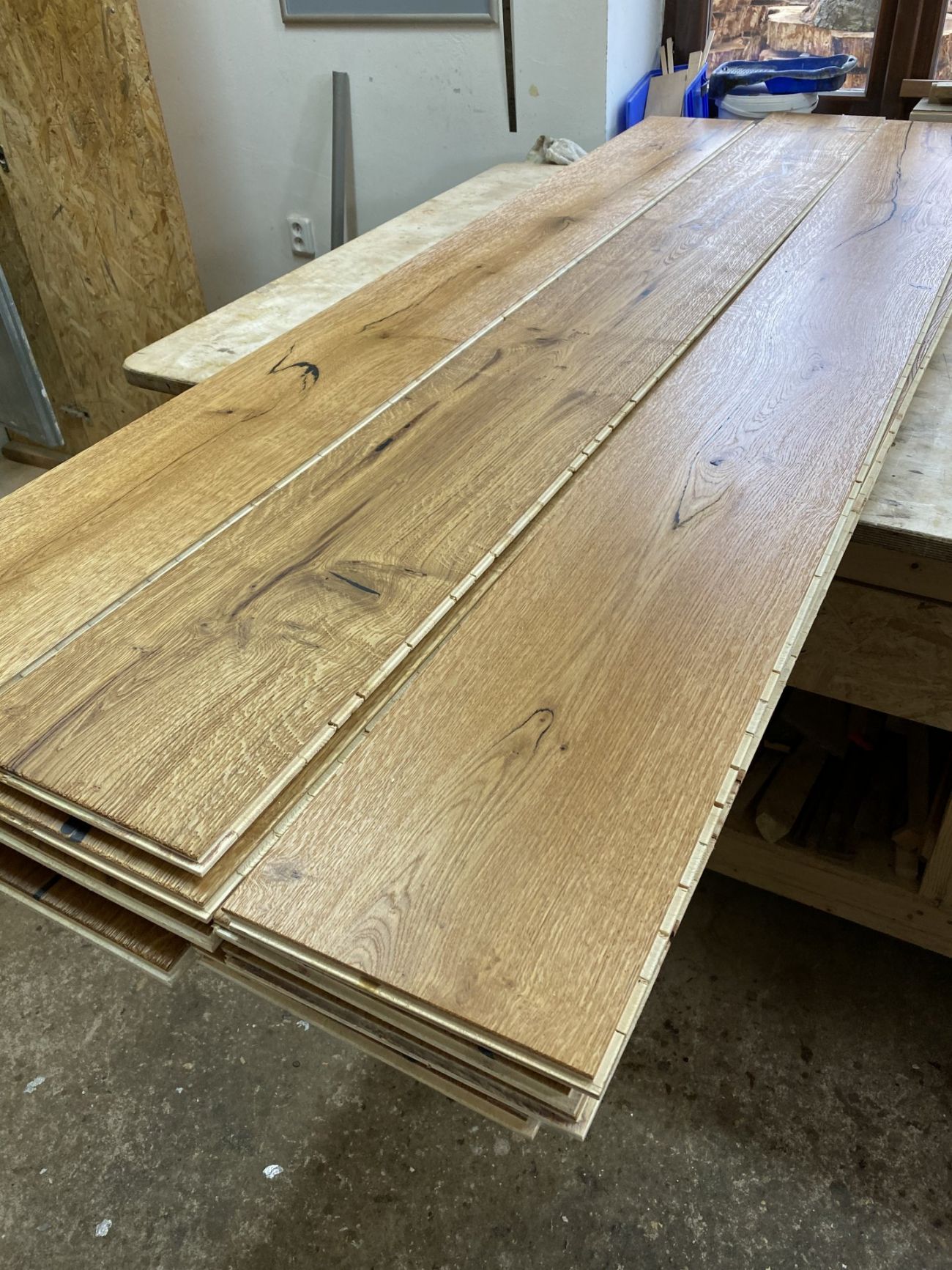 Ze stavby míříme přímo do lesa, kde už čeká na zpracování starý padlý dub. Letitý obr tu roky bez povšimnutí jen ležel, a to se na něm podepsalo. Kde by však jiní hledali chyby a vady, Robert Gross ze společnosti Wowood vidí jen krásu a unikátní obrazce, které vlhkost nebo škůdci na dřevě vytvořili. Tento materiál plánujeme využít také v koupelně, kde začneme i s výběrem obkladů.