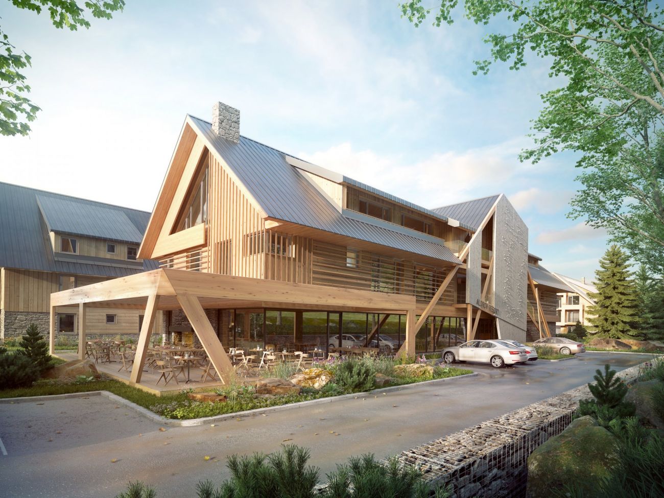 Další dvě samostatné budovy pak budou vyhrazeny službám prvotřídního horského hotelu – recepci, službám concierge, wellness & spa, snídaňové lounge, restauraci s vinným barem nebo vlastní pekárně. Majitelé a návštěvníci se tak mohou těšit na veškeré pohodlí.
