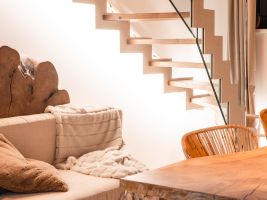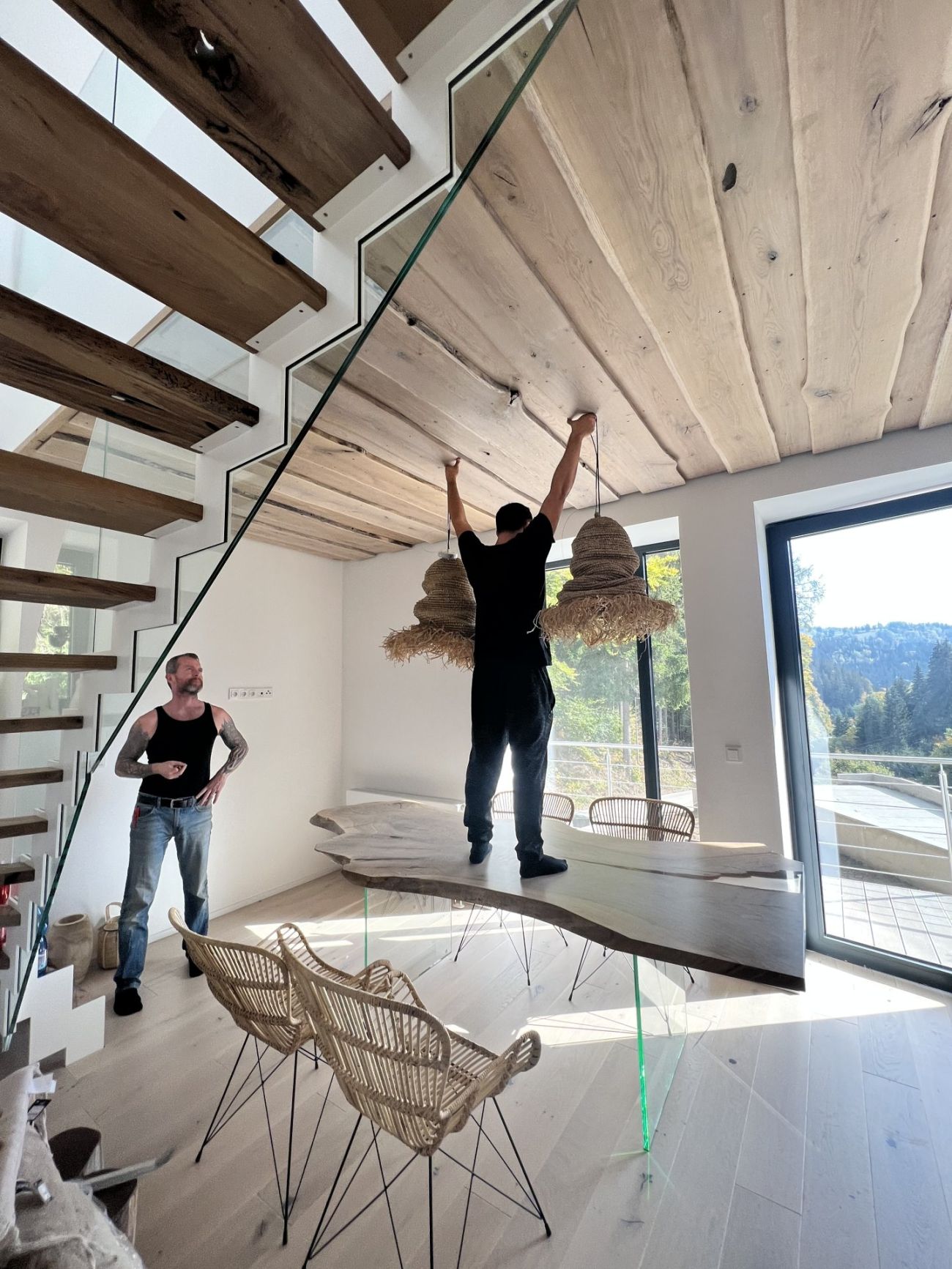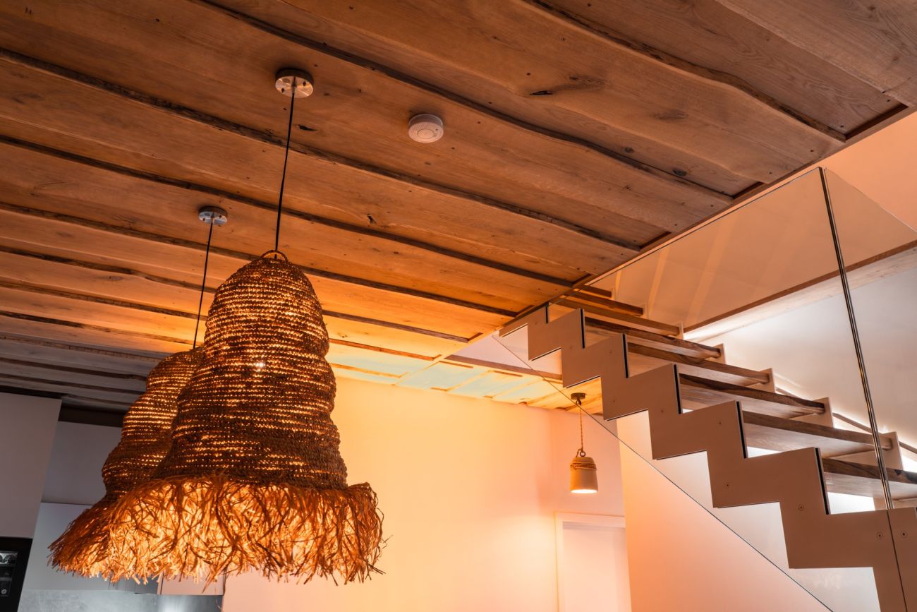Dalším úkolem bylo vytvořit dřevěné obložení stropu, také zde se muselo složitě měřit, řezat a zkoušet tak, aby vše bylo na míru rekonstruovanému apartmánu. Také zde se práce nakonec zdařila stejně jako v případě designových schodů. Ty byly vytvořeny z dubového dřeva v co nejvíce možné přirozené podobě. Velkou zajímavostí je, že stupy jsou z části vylévané čirým epoxidem, což dokonale ladí se skleněnými prvky, a svými detaily se tak schody stávají unikátním designovým kouskem. „Zde je práce oproti klasické truhlařině úplně převrácená. Pro tyto schody jsme vybrali dřevo, které bychom jinak nezužitkovali a museli vyhodit. Výhodou je ovšem to, že takové kusy dřeva se pyšní nádhernými detaily, které v případě schodů ještě zvýrazníme. Co se dřeva týká, dub jsme namořili bílým mořidlem a ošetřili olejem,“ říká Robert Gross ze společnosti WoWood.