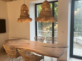 Velký rodinný stůl inspirovaný krkonošskou přírodou vznikal tak, aby korespondoval s moderním a svěžím interiérem horského apartmánu a přirozeně navazoval na podlahu z běleného dubu. Ne vždy jde ale vše hladce, a i při výrobě tohoto stolu se muselo řešit několik komplikací. Nakonec se ale vše díky důmyslnosti truhlářů zvládlo a výsledkem je jedinečný stůl, který se stane dominantou spodního patra.