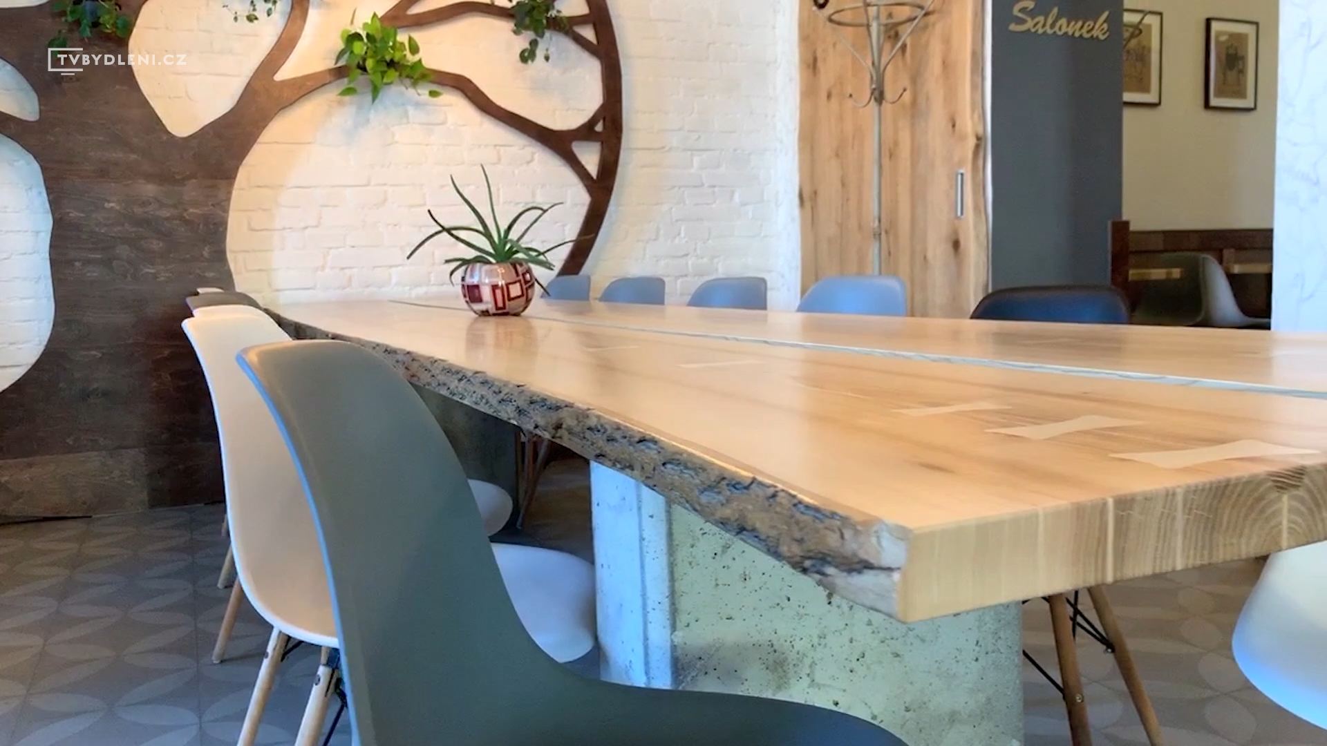 Radost rozhodně udělaly dva konferenční stolky. Ty sice na první pohled vypadají stejně, ale u každého z nich byl zvolen jiný způsob výroby. „První stolek je pravidelný ovál, v němž jsou naskládané kusy jednotlivých příčných řezů, zbytek je vylit čirou epoxidovou stěrkou do tvaru kruhu. Druhý stolek má nepravidelný tvar, neboť se jedná o řez kmene v původním tvaru, epoxid zde byl využit pouze pro dolití prázdných míst. Oba konferenční stolky dostanou bílé kovové stojny, což je velmi jednoduché řešení, které neodvede pozornost od unikátního vzhledu dřevěné desky,“ říká Robert Gross ze společnosti WoWood a dodává: „Nařezaný strom necháváme až tři roky odležet, poté dřevo dáváme do sušárny, kde pomalým způsobem sušení, které trvá i několik měsíců, doschne. Poté se materiál dává na sklad. Ve chvíli, kdy daný kus dřeva zvolíme jako vhodný pro výrobu, pracujeme týdny na tom, aby se z něj stal unikátní interiérový prvek. Jednotlivé technologické kroky mohou trvat u náročného projektu i dva měsíce.“