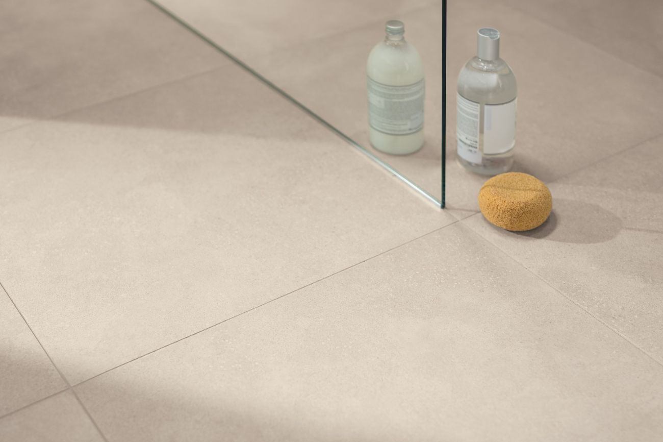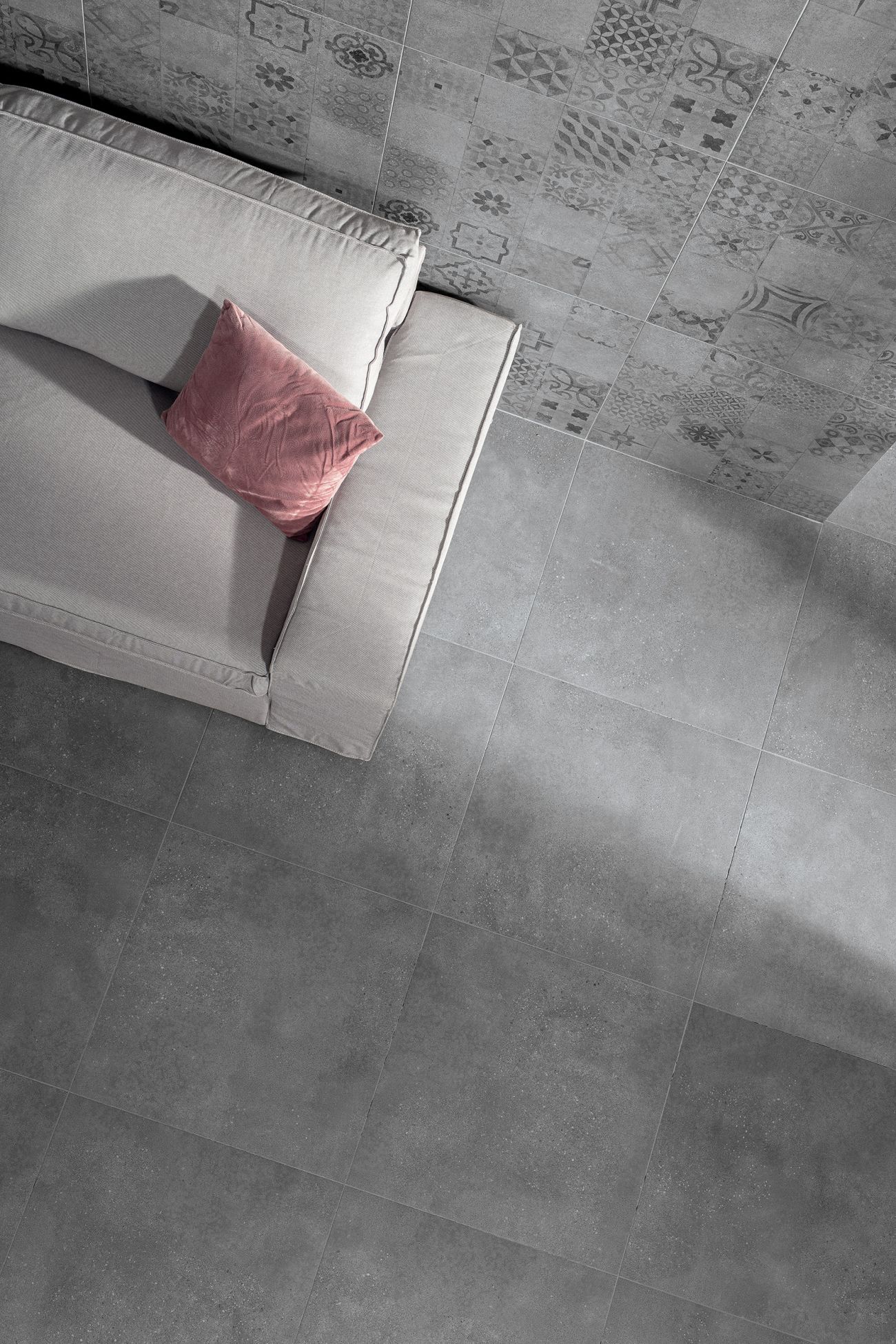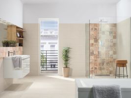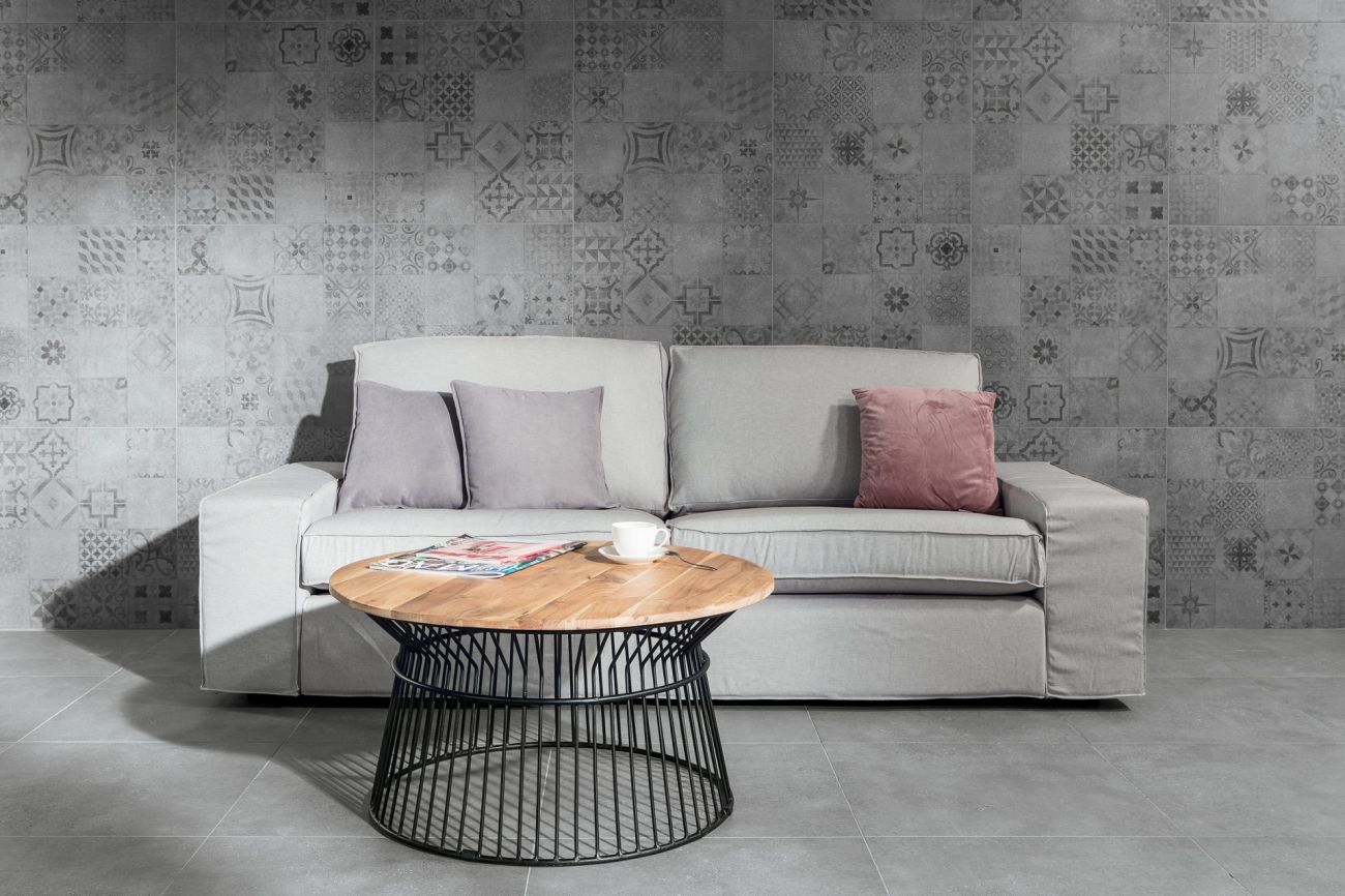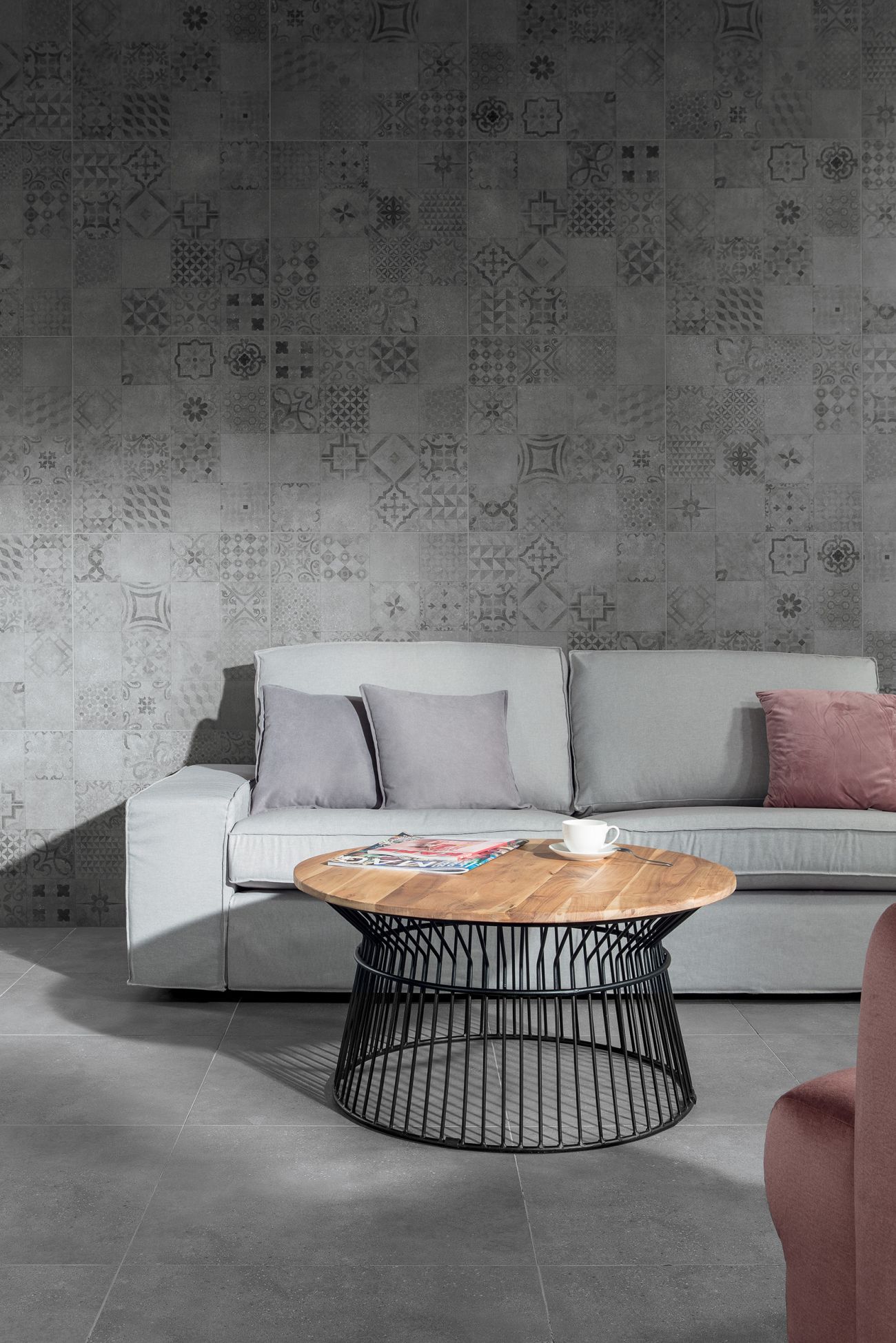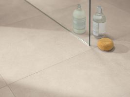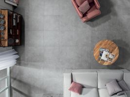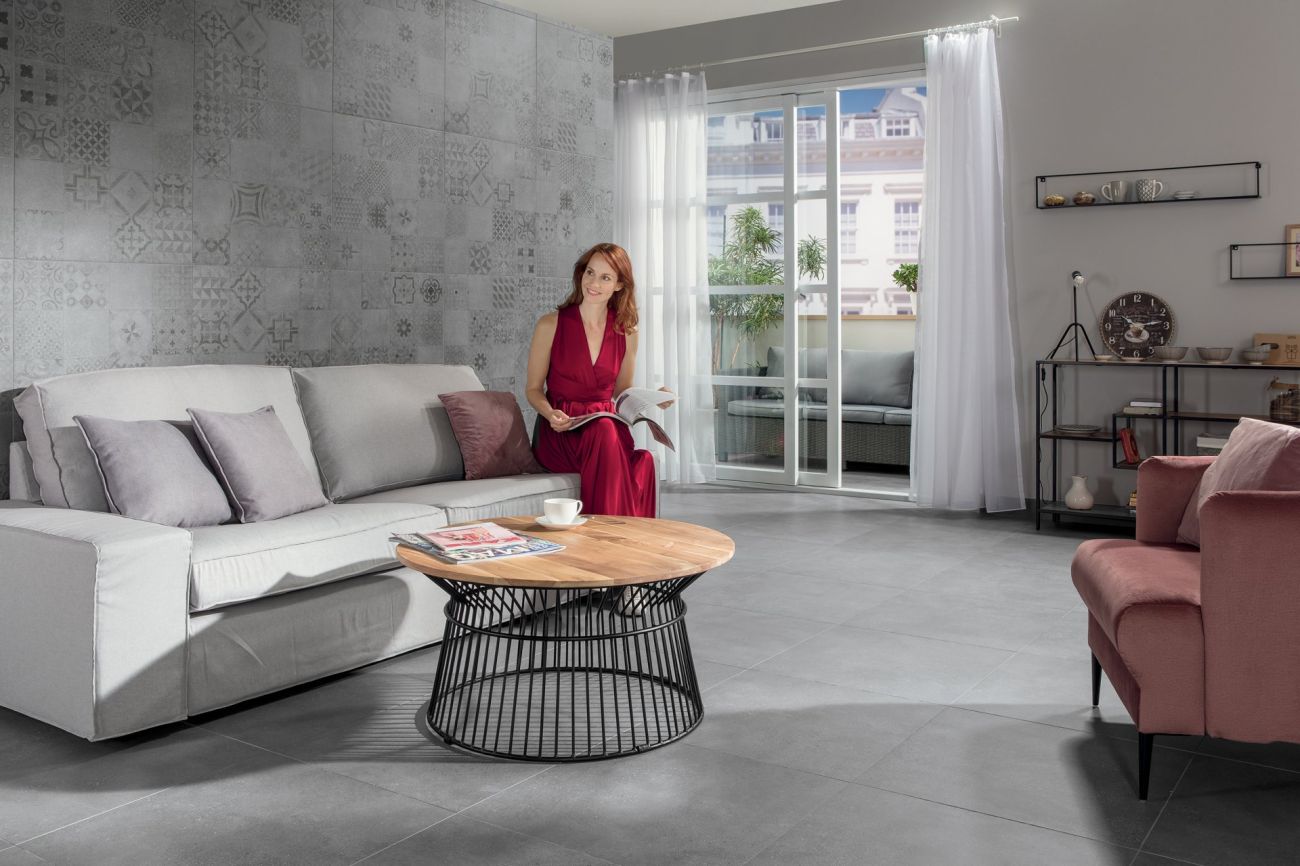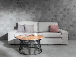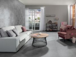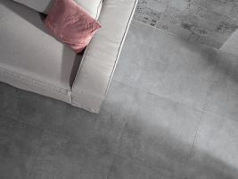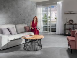 Obklady v imitaci betonové stěrky pak lze využít například v industriálně laděných interiérech. Výhodou je lehká údržba, velký formát o rozměrech 60 x 120 cm, 60 x 60 cm, 80 x 80 cm, a především tvrdost a protiskluzovost.