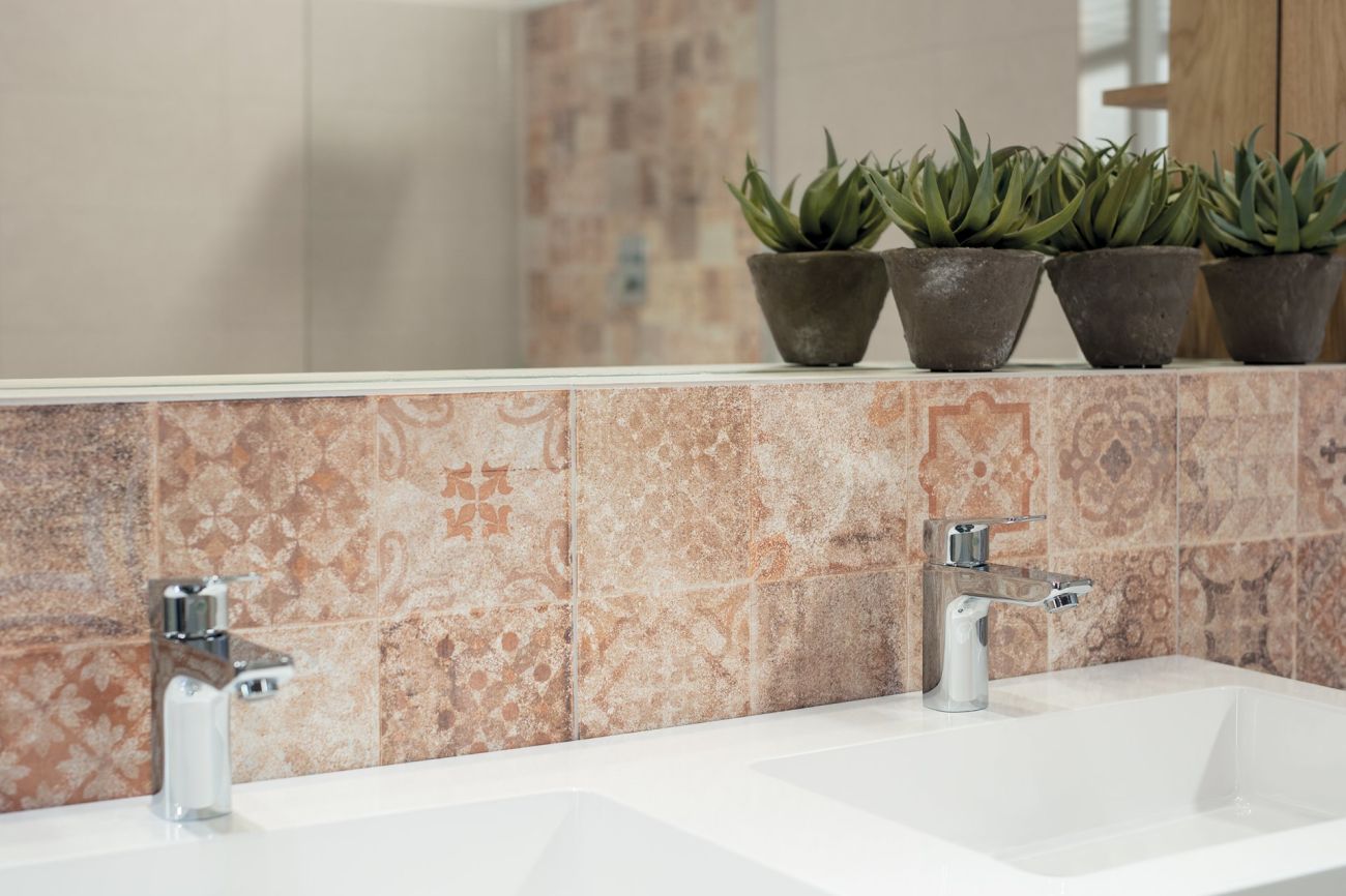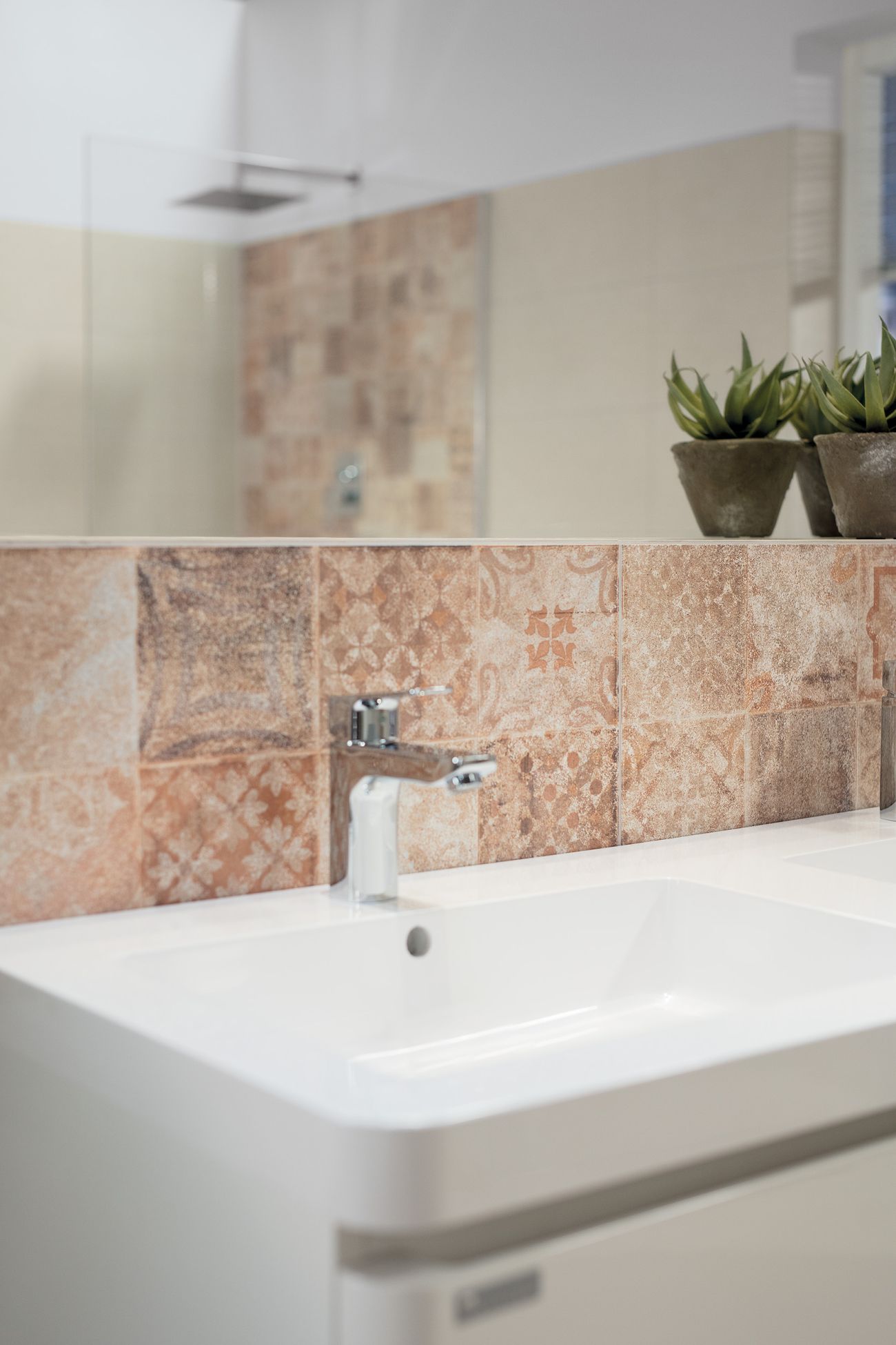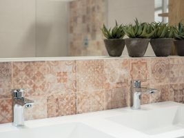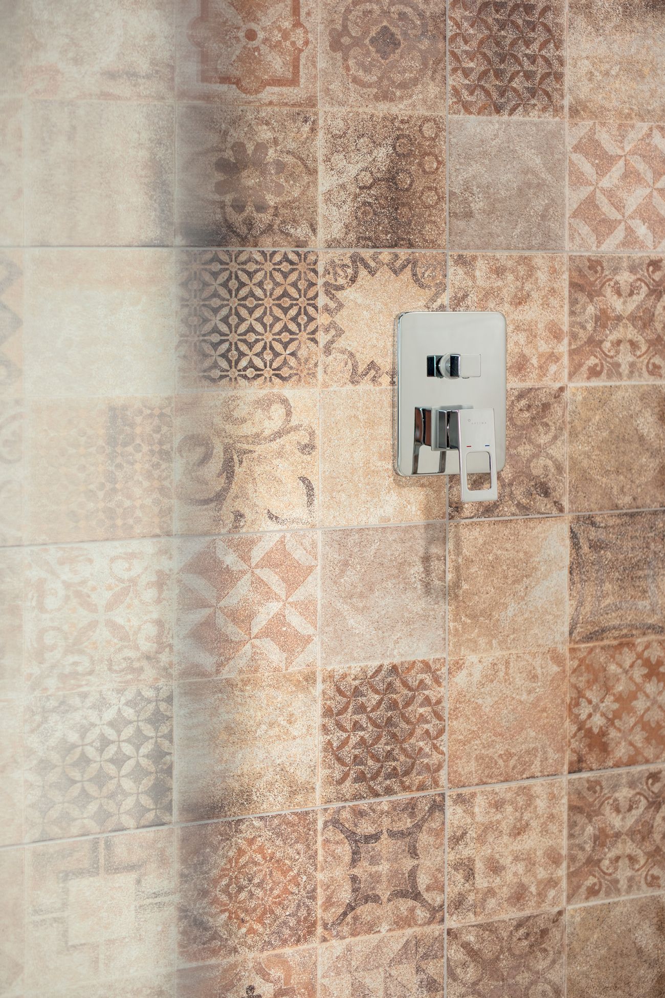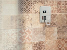 Dlažbu s patchworkovými motivy lze využít například jako jednu řadu nad umyvadlem, tak jako celou stěnu, kde krásně vynikne dekor. K motivu se hodí skvěle dřevěná umyvadlová deska či podsvícené zrcadlo.