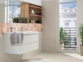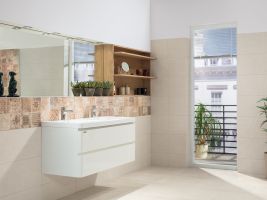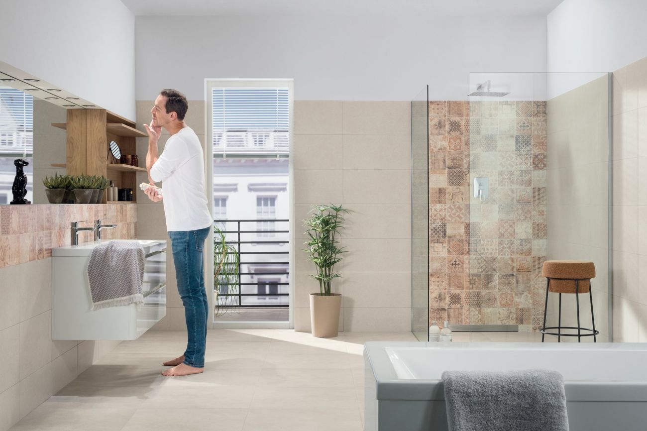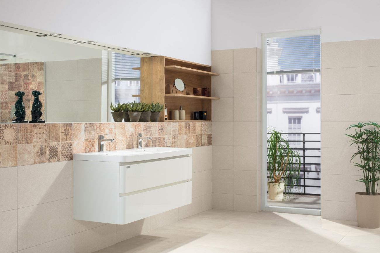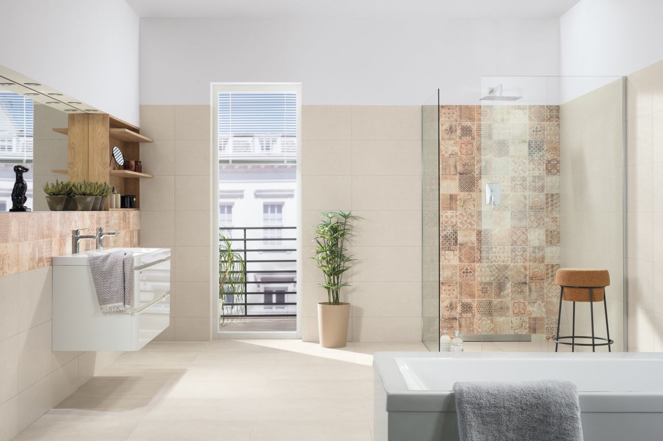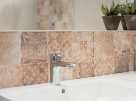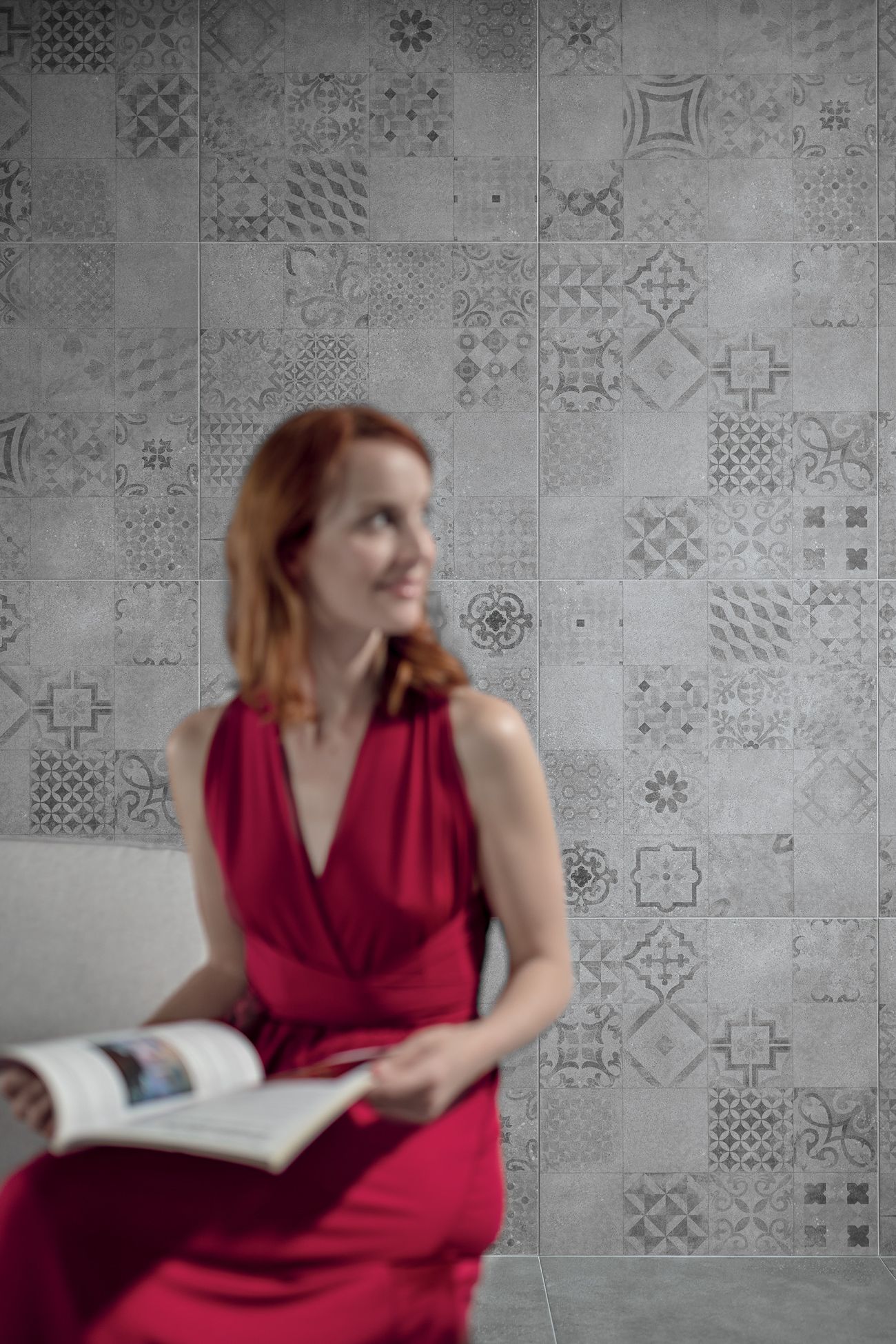 Dlažbu s patchworkovými motivy lze využít například jako jednu řadu nad umyvadlem, tak jako celou stěnu, kde krásně vynikne dekor. K motivu se hodí skvěle dřevěná umyvadlová deska či podsvícené zrcadlo.