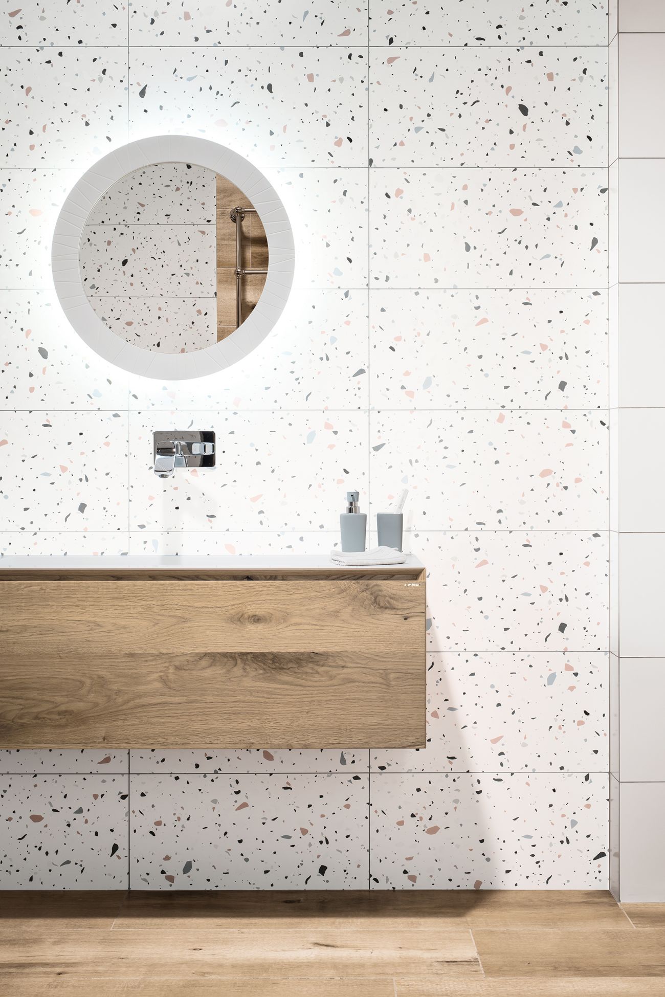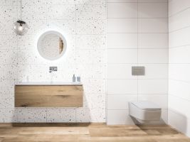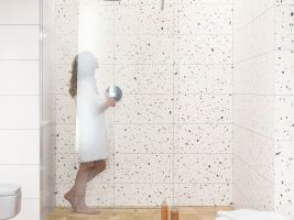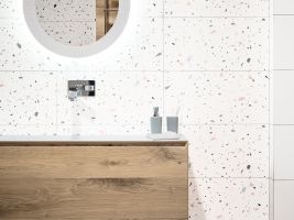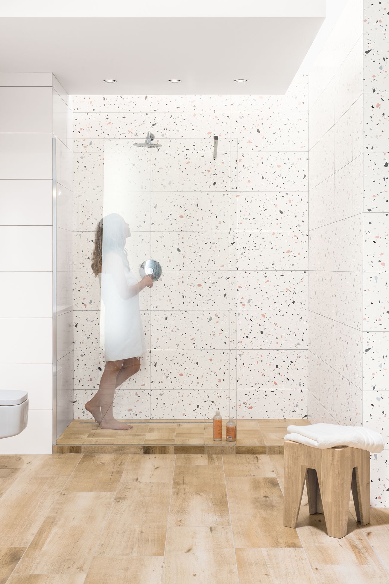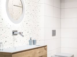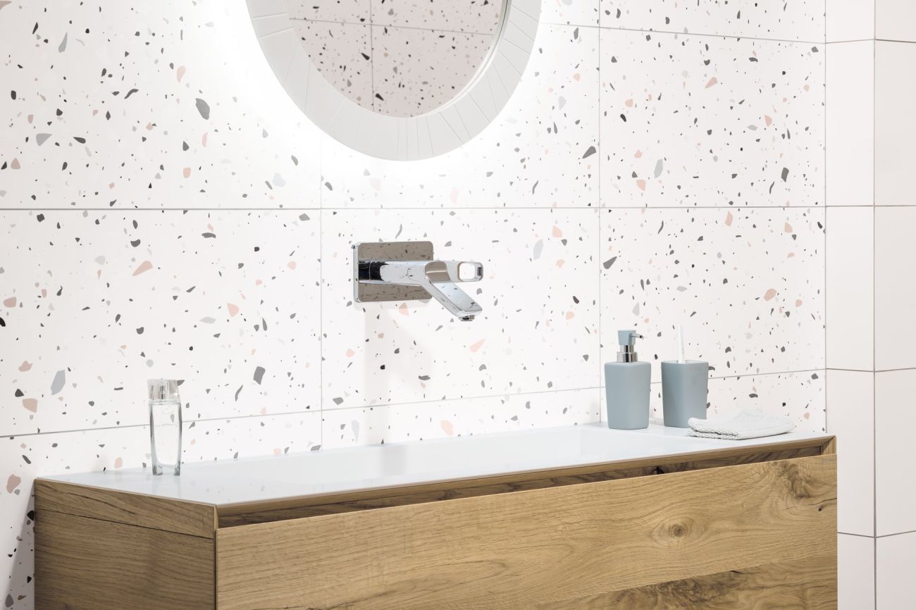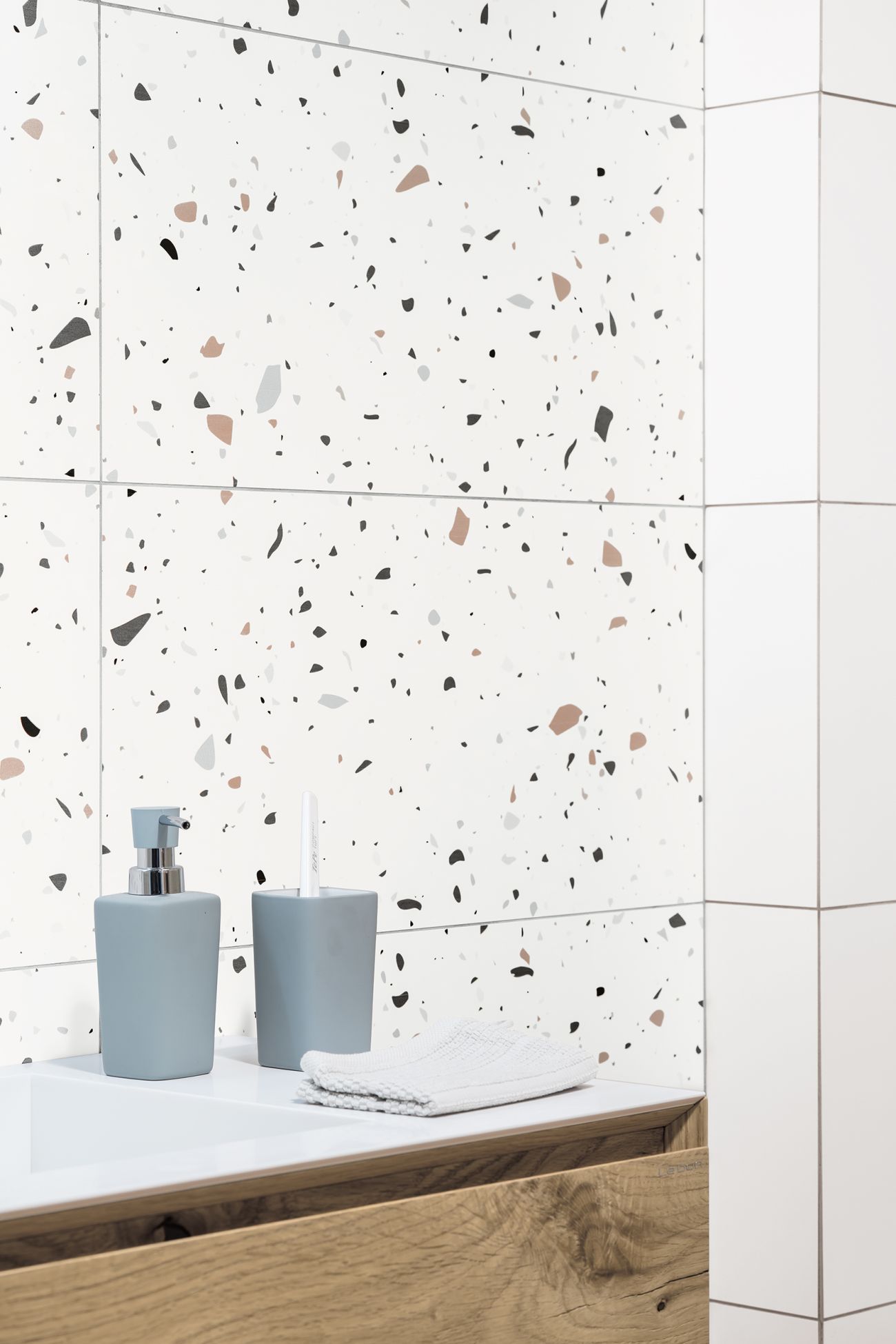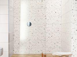 Obklad Spectra od společnosti RAKO působí v koupelně velmi čistě a elegantně. Předností rektifikovaných obkladů ve formátu 30 x 60 cm je široké využití. K sehnání jsou tři barevné varianty. Základ v barvě slonové kosti doplňují různé vzory s mixem barev. Výrobky jsou vhodné pro obkládání celé stěny, kde působí jako tapeta, nebo si s nimi můžete kreativně pohrát a vytvořit dekorativní prvky, a to i díky řezané mozaice 5 x 5 cm. Tuto sérii je vhodné doplnit podlahou v dekoru dřeva, např. série Saloon, Faro, či Board, pro více industriální vzhled poslouží dlaždice série Rebel nebo Blend.