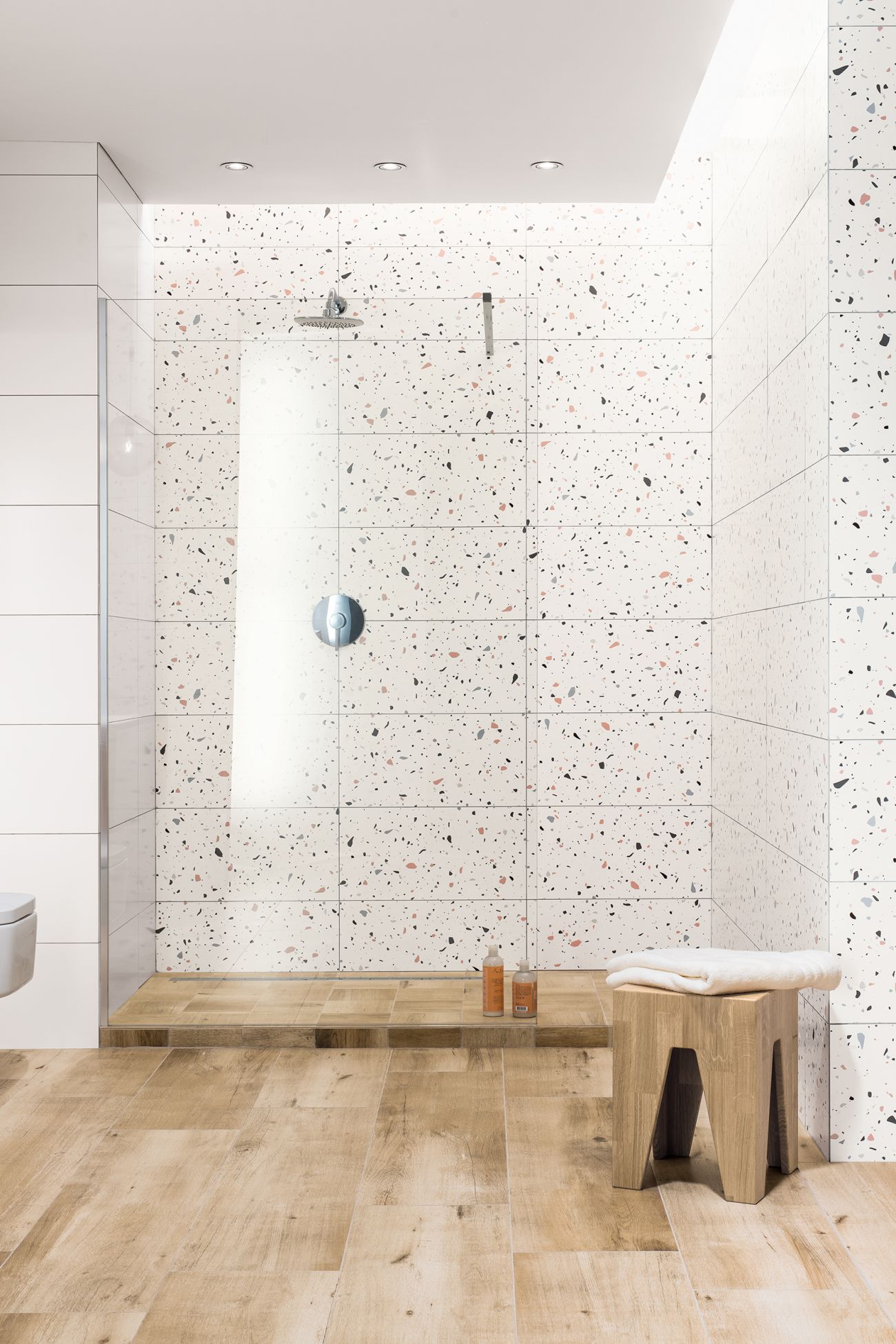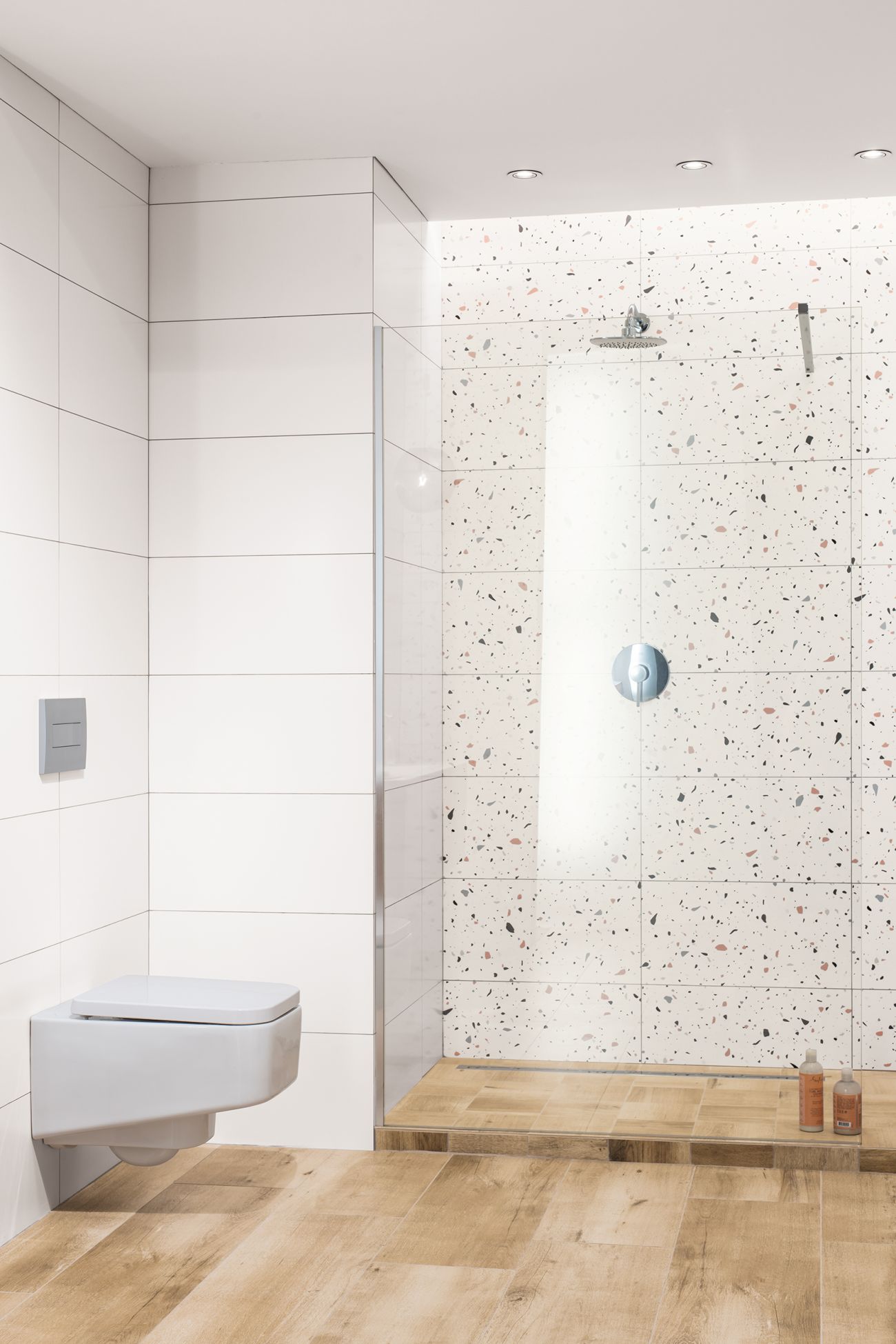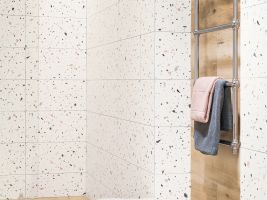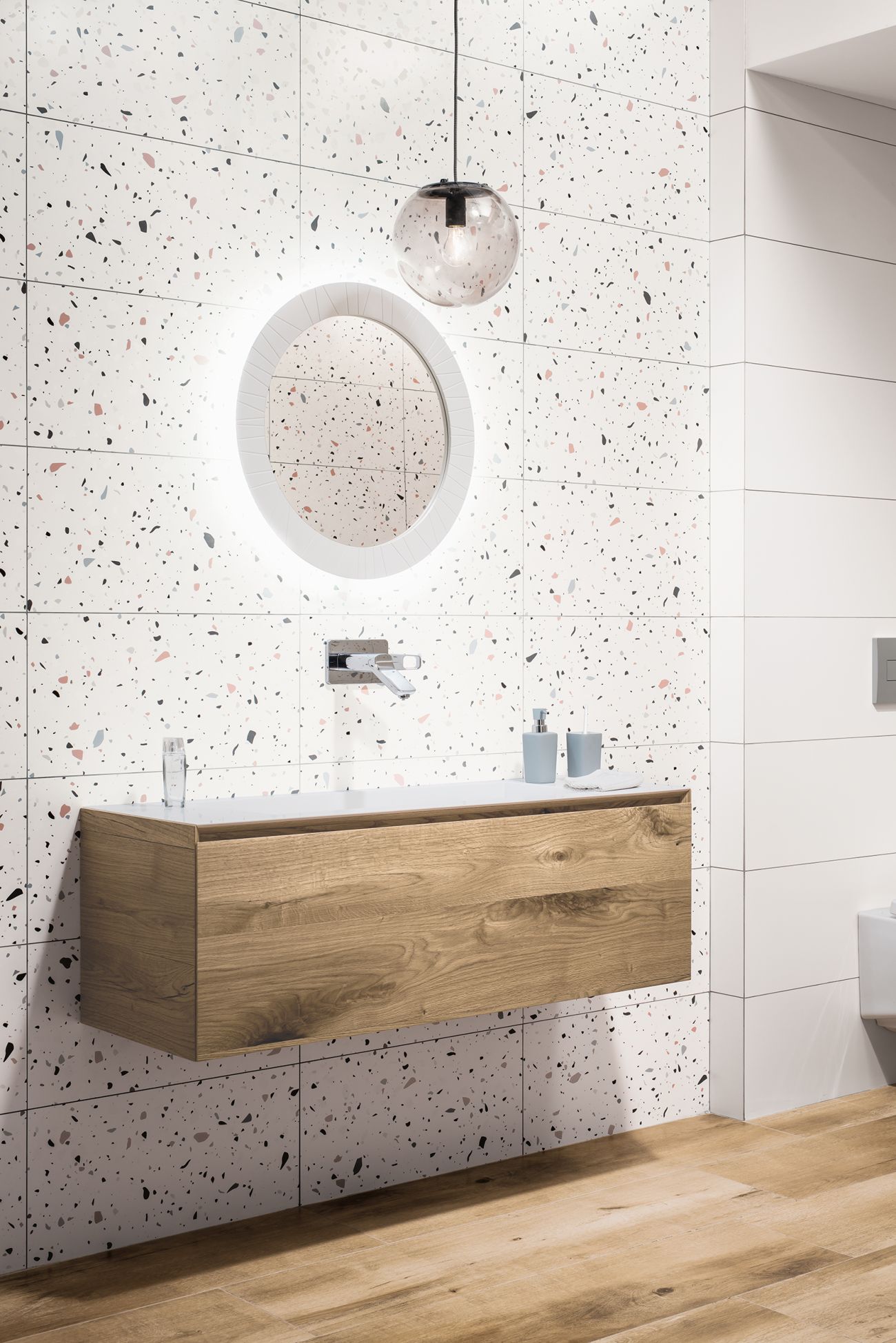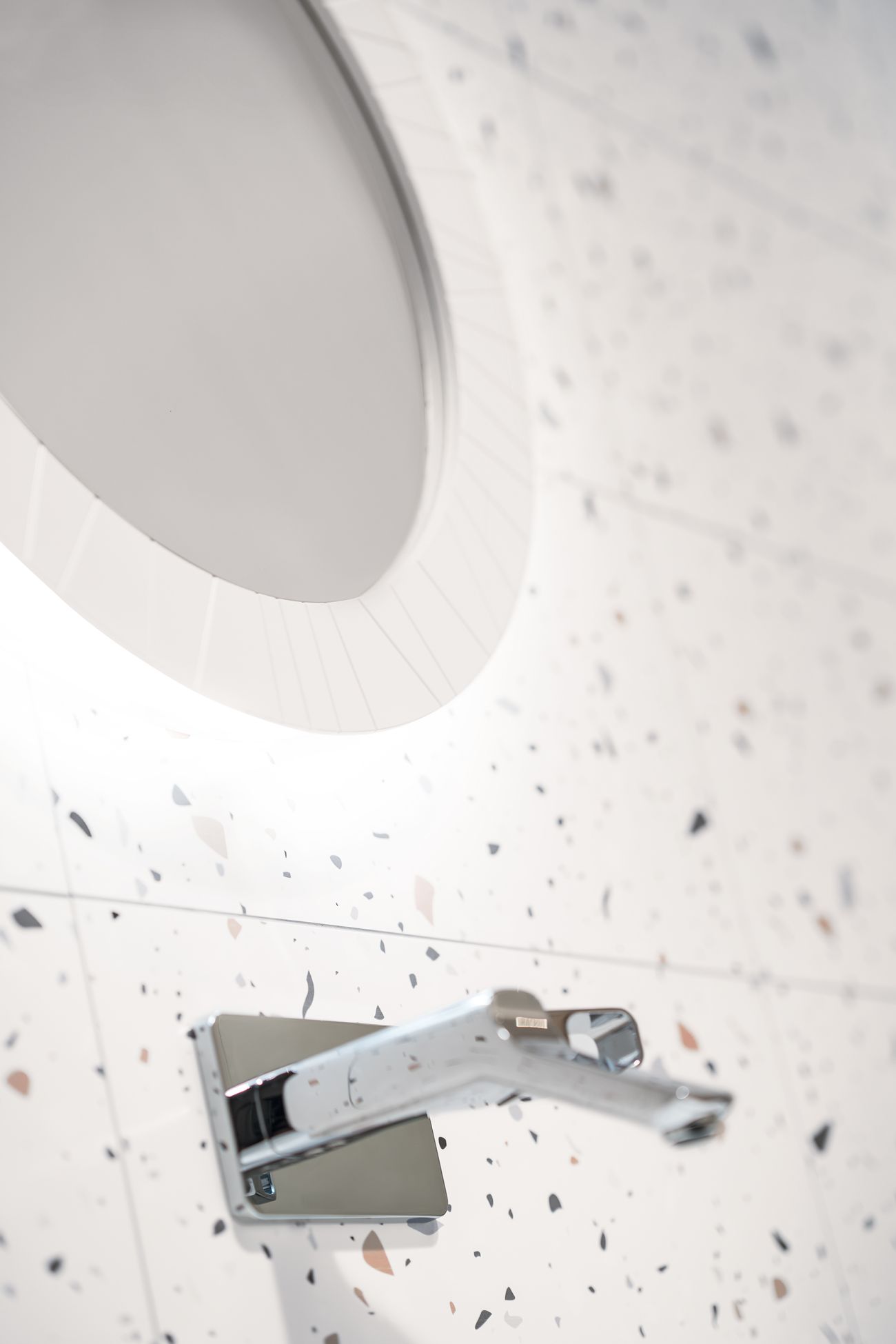 Obklad Spectra od společnosti RAKO působí v koupelně velmi čistě a elegantně. Předností rektifikovaných obkladů ve formátu 30 x 60 cm je široké využití. K sehnání jsou tři barevné varianty. Základ v barvě slonové kosti doplňují různé vzory s mixem barev. Výrobky jsou vhodné pro obkládání celé stěny, kde působí jako tapeta, nebo si s nimi můžete kreativně pohrát a vytvořit dekorativní prvky, a to i díky řezané mozaice 5 x 5 cm. Tuto sérii je vhodné doplnit podlahou v dekoru dřeva, např. série Saloon, Faro, či Board, pro více industriální vzhled poslouží dlaždice série Rebel nebo Blend.